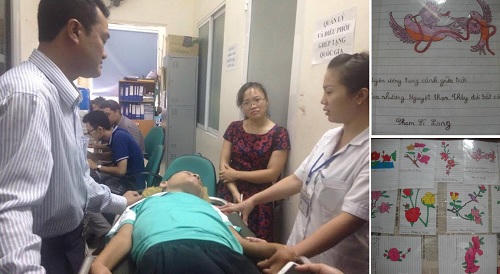 | Long tại Trung tâm Điều phối Quốc gia về ghép bộ phận cơ thể (ảnh to) và các bức họa do chính Long sáng tác. |