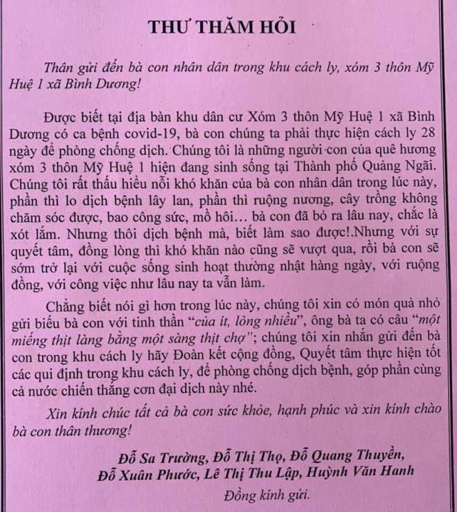 Ông Đỗ Minh Huấn, Chủ tịch UBND xã Bình Dương, cho biết, thời gian cách ly, bà con xóm 3 nhận được sự giúp đỡ của nhiều người dân trong và ngoài huyện. Đặc biệt, có 6 người sinh ra ở xóm 3 đang an cư lập nghiệp ở TP Quảng Ngãi đã gửi thư về thăm hỏi, động viên tinh thần đồng hương, khiến bà con cảm động.