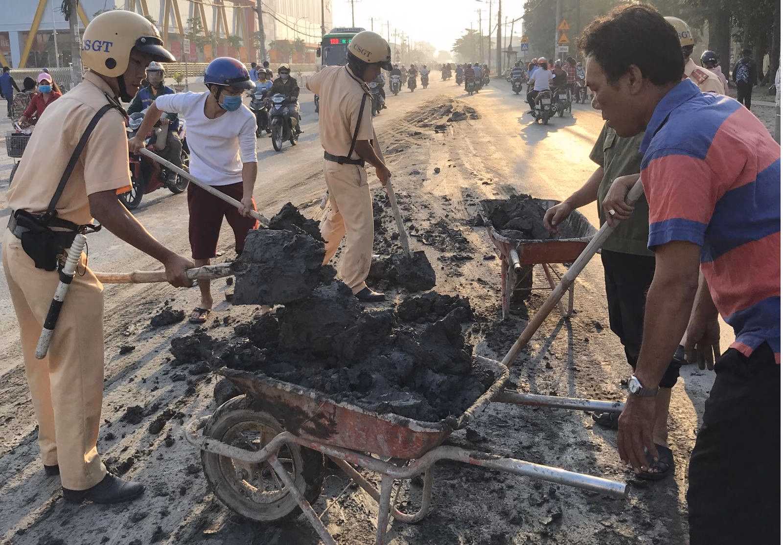 Hình ảnh các Cảnh sát giao thông (CSGT) cầm xẻng, cầm chổi hàng giờ xúc, dọn bùn đất, đá sỏi... do các xe vận chuyển làm rơi ra đường lúc sáng sớm hoặc trong đêm tối đã và đang nhận được ý kiến bày tỏ sự cảm phục của cư dân mạng.