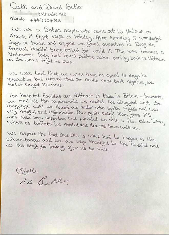 Họ cũng cho biết được hướng dẫn viên du lịch hỗ trợ một số đồ dùng cần thiết mà những khách du lịch thường không mang theo. Khép lại lá thư, ông bà Butler bày tỏ: “Chúng tôi rất hiểu được thực tế này, đây là điều cần làm trong tình hình hiện nay và chúng tôi rất biết ơn bệnh viện cũng như tất cả các nhân viên y tế tại đây vì đã chăm sóc cho chúng tôi rất tốt”.