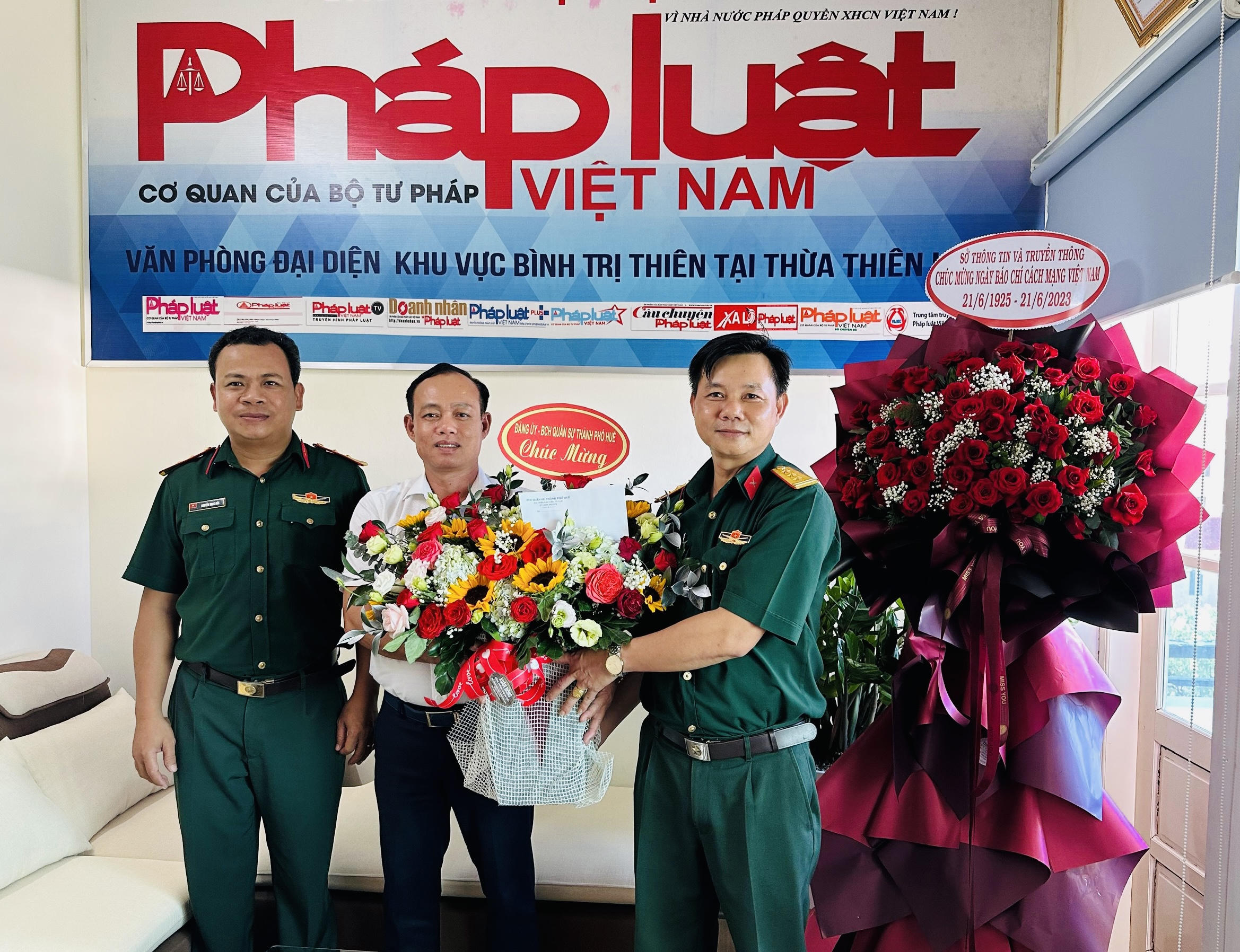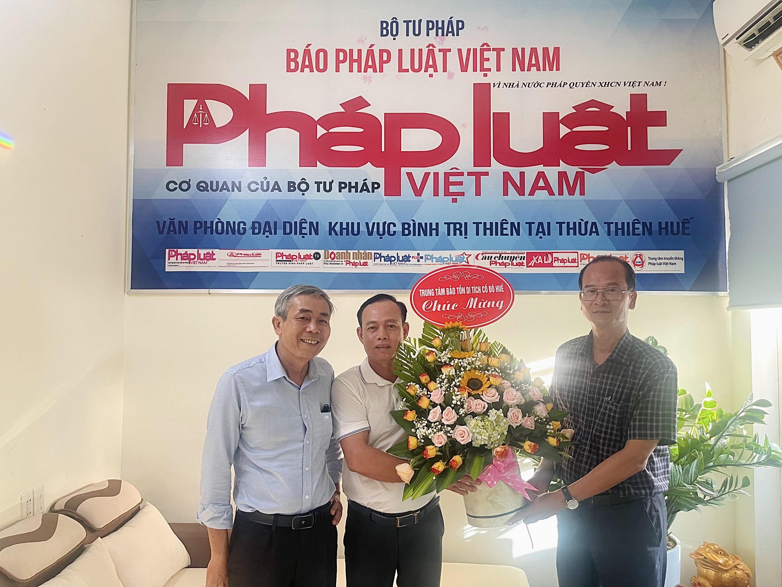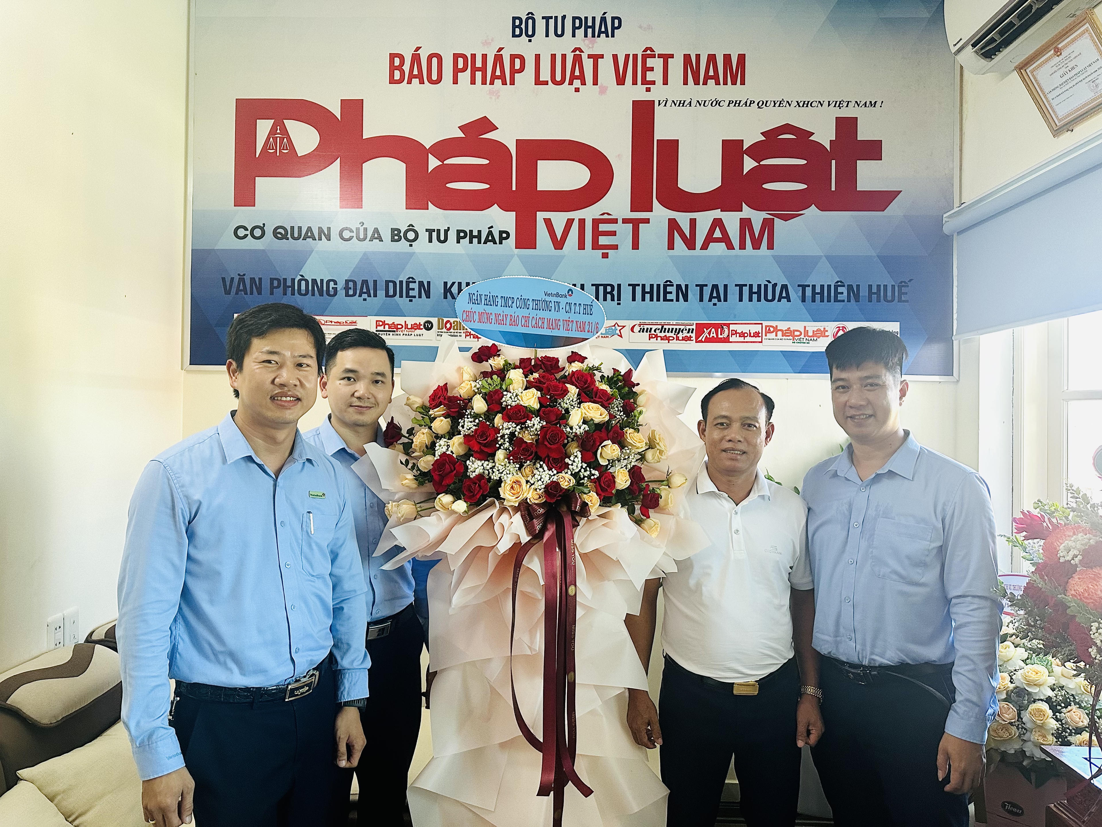 Tại Văn phòng đại diện (VPĐD) Báo Pháp luật Việt Nam Khu vực Bình Trị Thiên, UBND tỉnh Thừa Thiên Huế, Thành uỷ - HĐND - UBND - UBMTTQVN TP Huế, Bộ Chỉ huy Quân sự tỉnh, Sở Thông tin và Truyền thông, Sở Tư pháp, Sở Kế hoạch và Đầu tư, Toà án nhân dân tỉnh, Trung tâm Bảo tồn Di tích Cố đô Huế, Đảng uỷ-BCH Quân sự TP Huế, UBND huyện A Lưới, Chi cục Kiểm lâm Thừa Thiên Huế, Bệnh viện Trung Ương Huế, Ngân hàng CSXH tỉnh, Ngân hàng Nông nghiệp và Phát triển Nông thôn Thừa Thiên Huế, Ngân hàng TMCP Công thương VN-CN Thừa Thiên Huế, Khoa Luật Hình sự Trường Đại học luật – Đại học Huế, Công ty Cổ phần Môi trường và Công trình Đô thị Huế, Công ty CP cấp nước cùng một số cơ quan, đơn vị, doanh nghiệp, bạn đọc Báo Pháp luật Việt Nam... tại Thừa Thiên Huế, Quảng Trị, Quảng Bình đã đến thăm, tặng hoa và chúc mừng đến cán bộ, phóng viên của Báo.