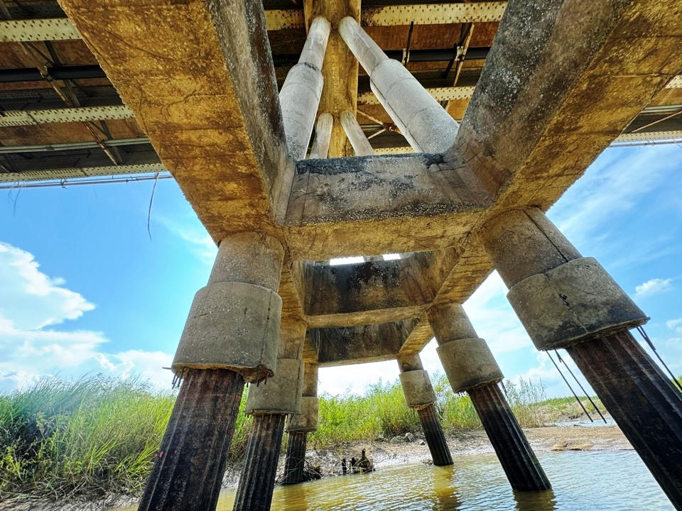 Trụ cầu Trà Khúc 1 bị bong lớp bê tông lộ ra cọc sắt. (Ảnh: HX) |