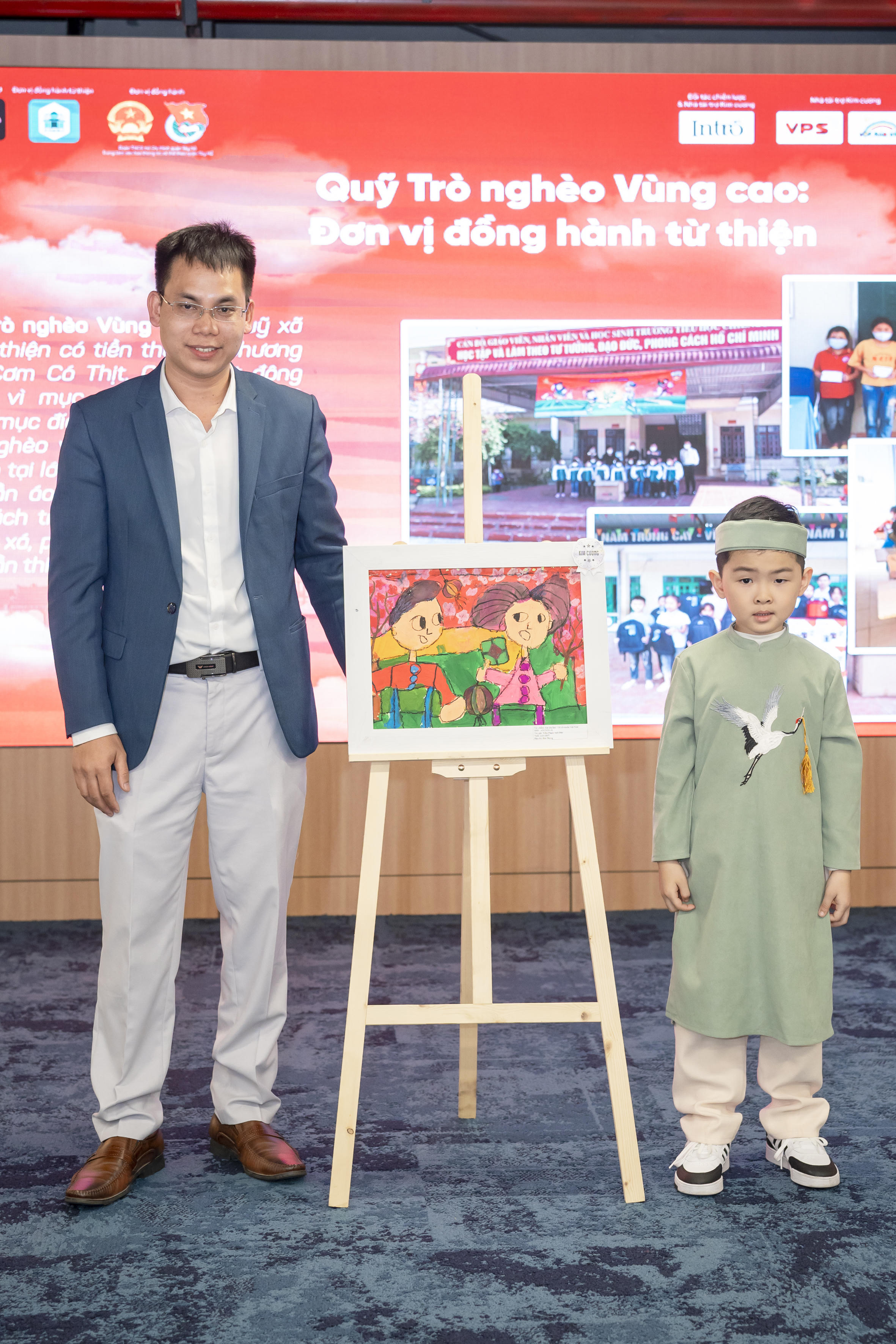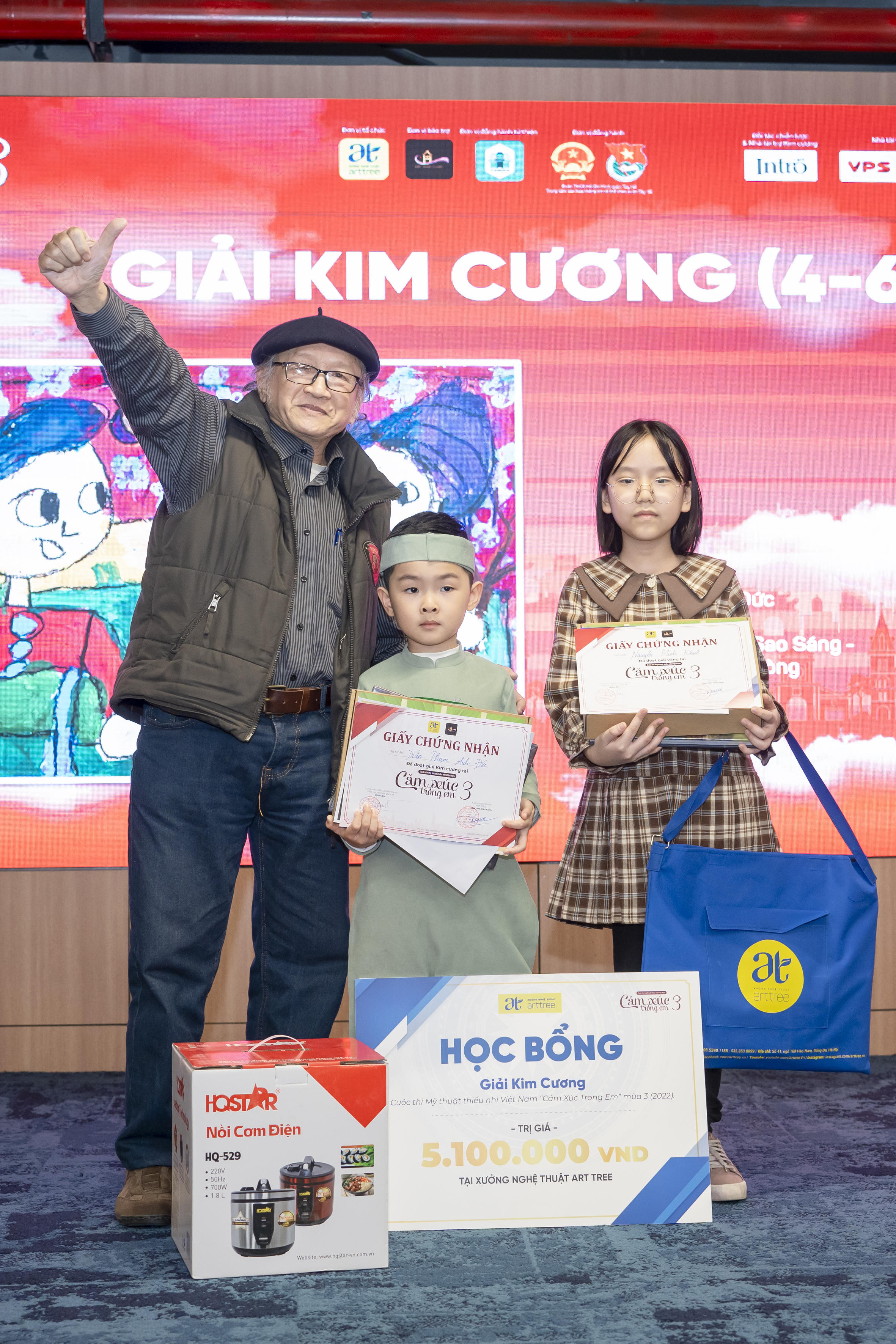 Đại diện Ban Giám Khảo - họa sĩ Lê Huy Văn - nguyên Phó Hiệu Trưởng Đại học Mỹ thuật Công nghiệp Hà Nội trao giải Kim Cương cho em Trần Phạm Anh Đức (đứng giữa) |