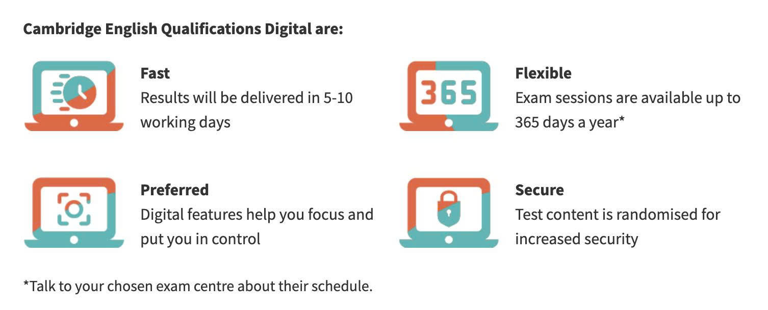 Cambridge English Qualifications Digital được thiết kế để tích hợp linh hoạt vào lịch học và hạ tầng số của các cơ sở giáo dục phổ thông và đại học, với nhiều lựa chọn ngày thi và địa điểm, giúp giảm trùng lịch và đơn giản hóa thủ tục. Hình thức thi trực tuyến cũng trả kết quả nhanh hơn, hỗ trợ kịp thời trong tuyển sinh, xếp lớp và xét tốt nghiệp.