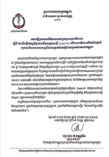 Theo thông cáo báo chí này, Bộ Y tế Campuchia khẳng định cơ quan này đã hợp tác với Tổ chức Y tế thế giới (WHO) và Cơ quan Kiểm soát dịch bệnh Mỹ (CDC) thực hiện các biện pháp kiểm tra đúng quy trình đối với toàn bộ thành viên trên tàu Westerdam, kết quả chưa phát hiện trường hợp nào dương tính với COVID-19.