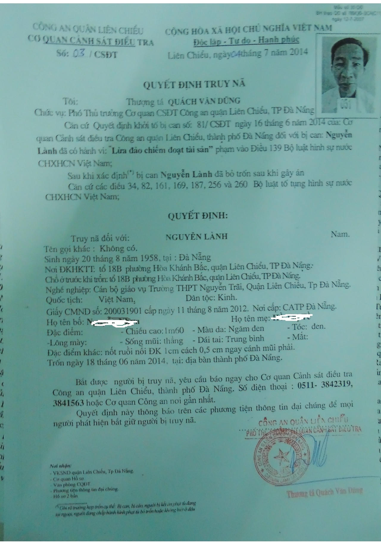 (PLO) - Cơ quan CSĐT công an quận vừa ra quyết định truy nã đối với bị can Nguyễn Lành (cán bộ phòng giáo vụ trường THPT Nguyễn Trãi, quận Liên Chiểu, SN 1958, trú phường Hòa Khánh Bắc, quận Liên Chiểu) về hành vi Lừa đảo chiếm đoạt tài sản.