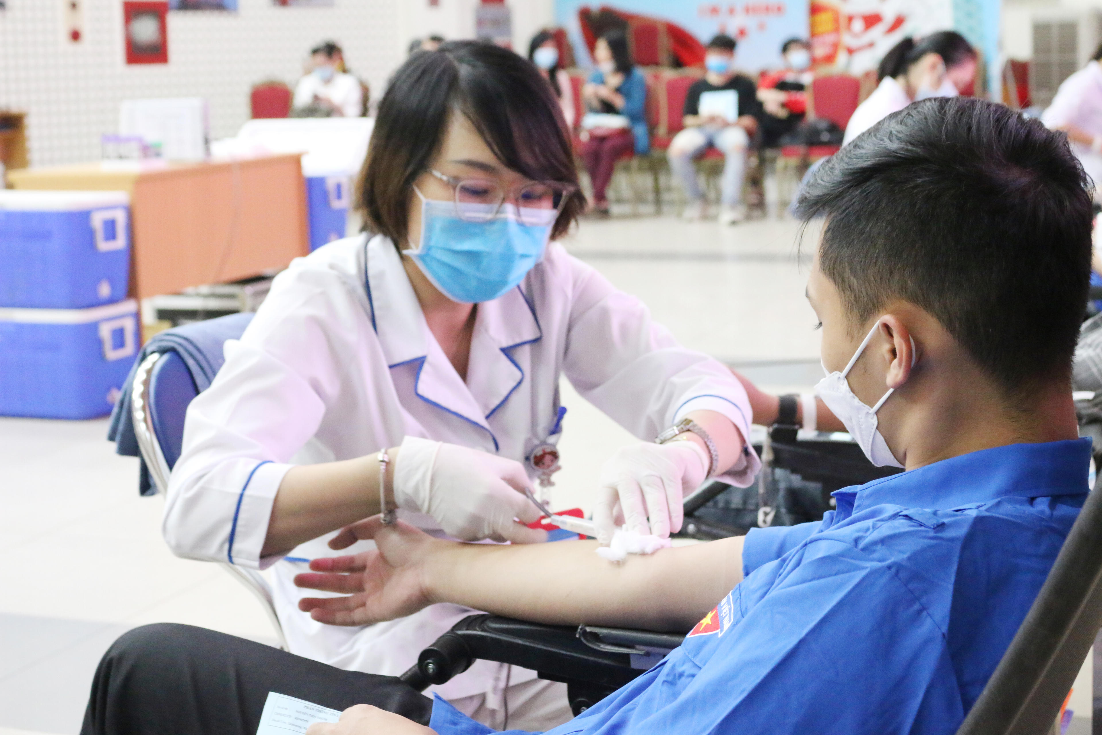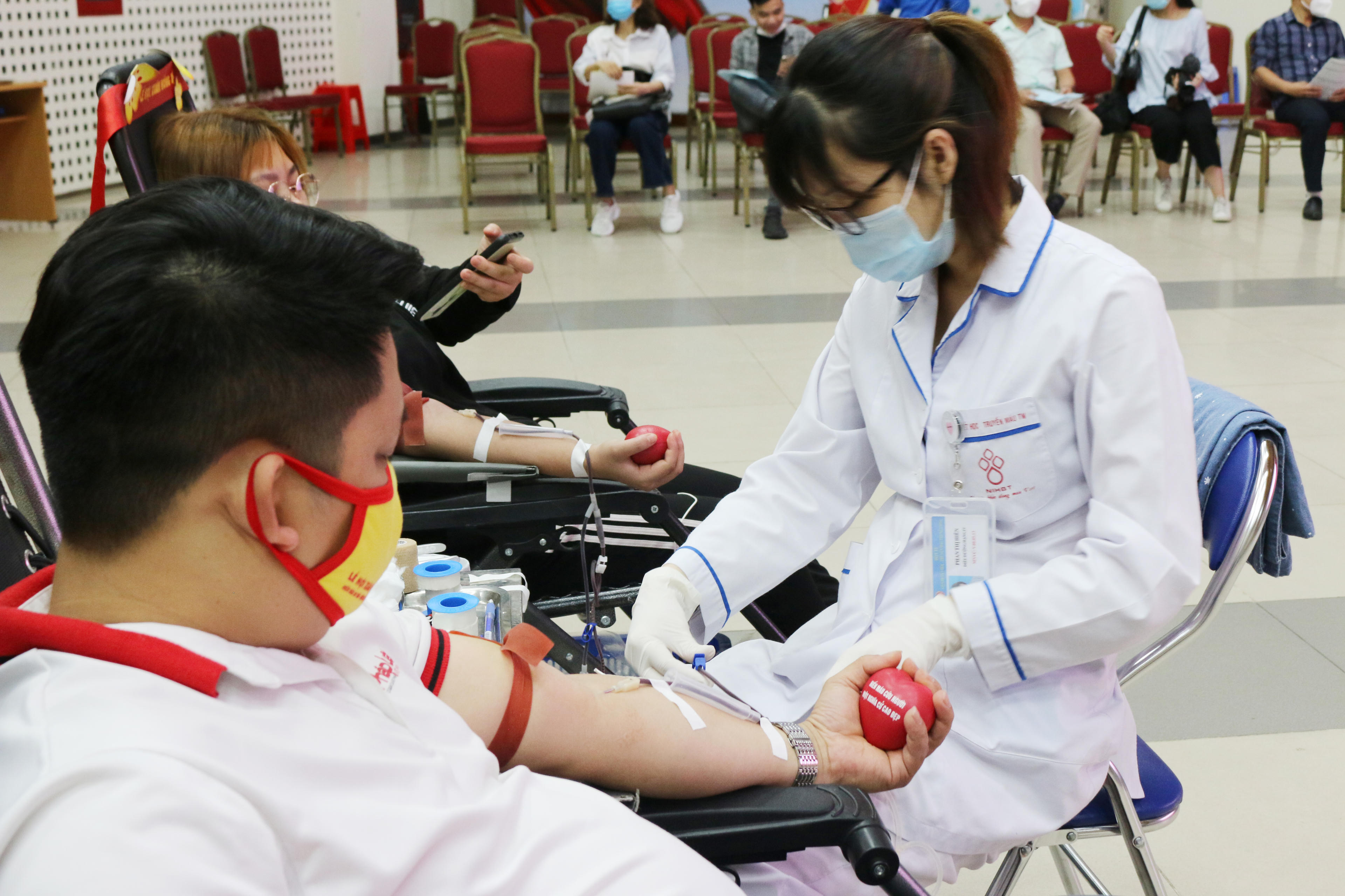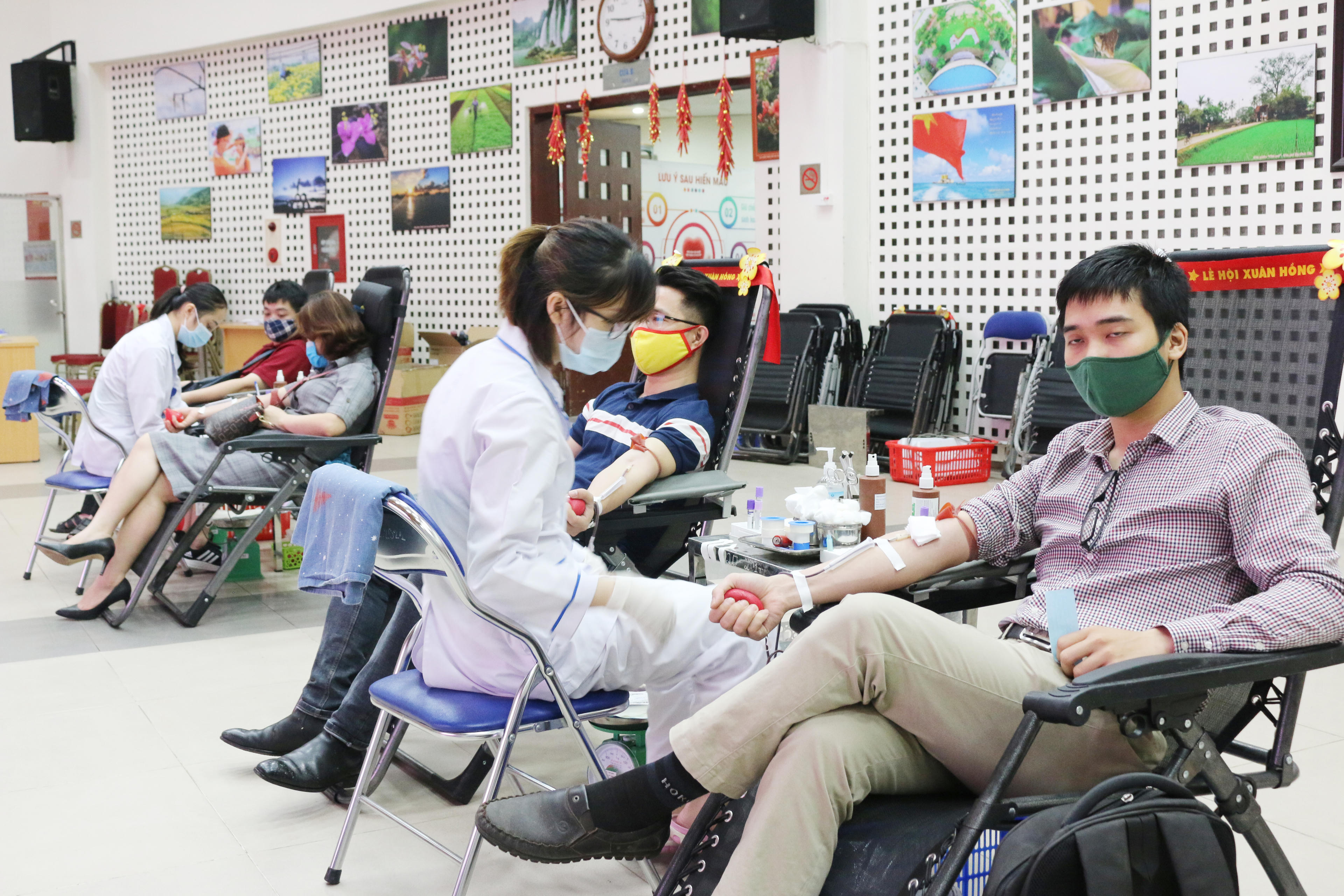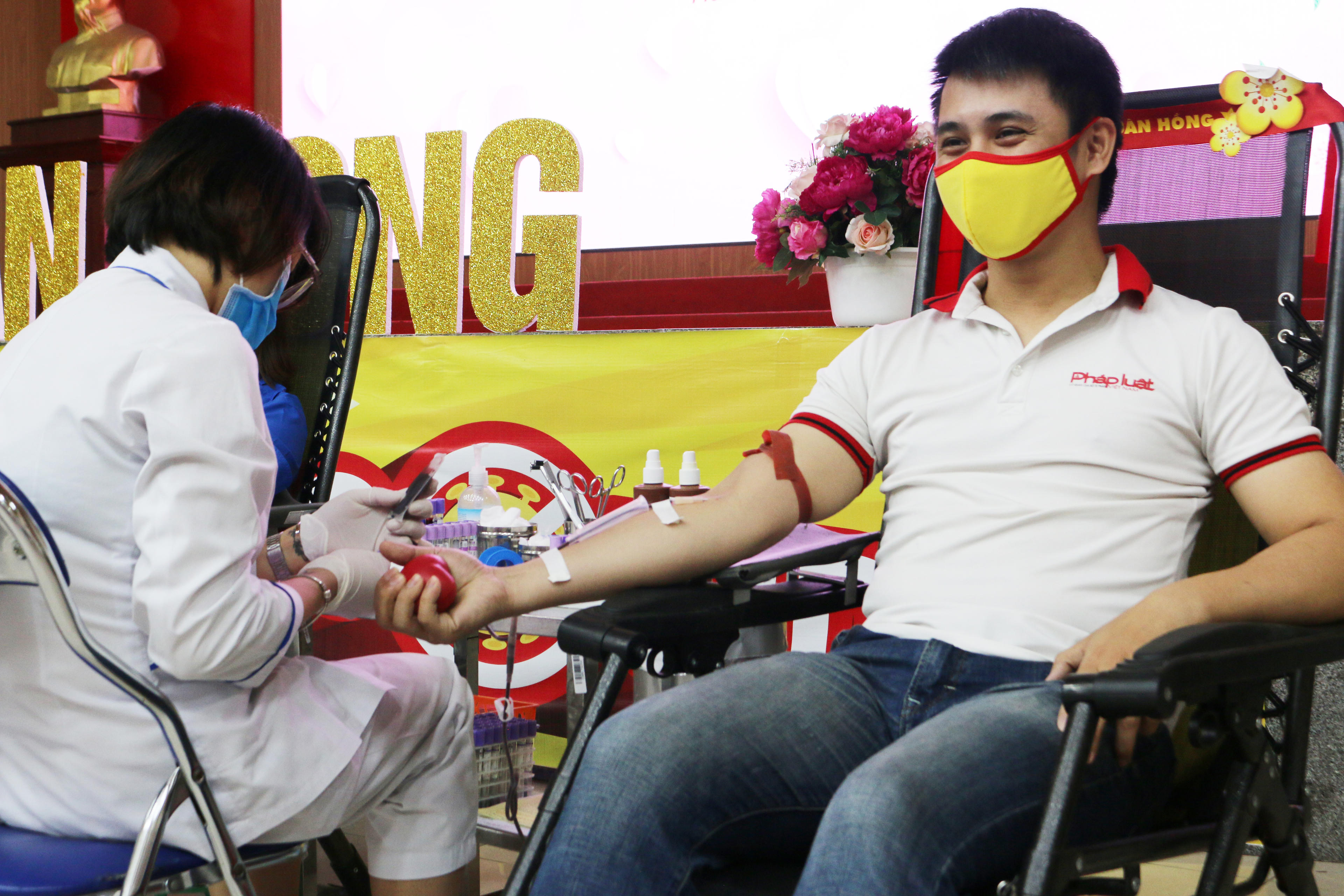 Ngay từ sáng sớm, tầng 2 khu vực hiến máu Viện Huyết học - Truyền máu Trung ương đã rộn ràng sắc đỏ của băng rôn, biểu ngữ cổ động hiến máu nhân đạo và màu áo xanh tình nguyện của cán bộ, đoàn viên thanh niên Báo Pháp luật Việt Nam.
