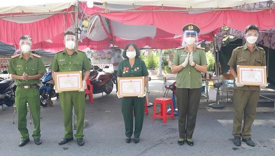 Bà Trần Thị Vàng, Đại úy Nguyễn Quốc Toàn (Cảnh sát khu vực Công an phường Phú Thọ) và anh Trương Hoàng Hải (dân phòng phường Phú Thọ) mới được Lãnh đạo Công an thành phố Thủ Dầu Một trao Giấy khen đột xuất.