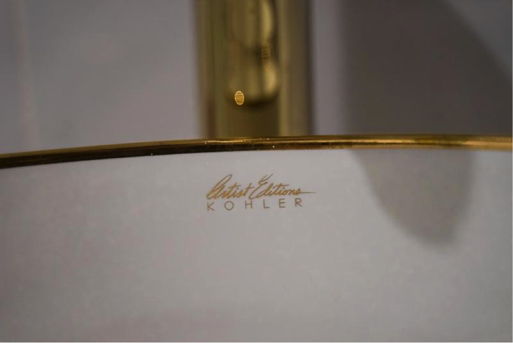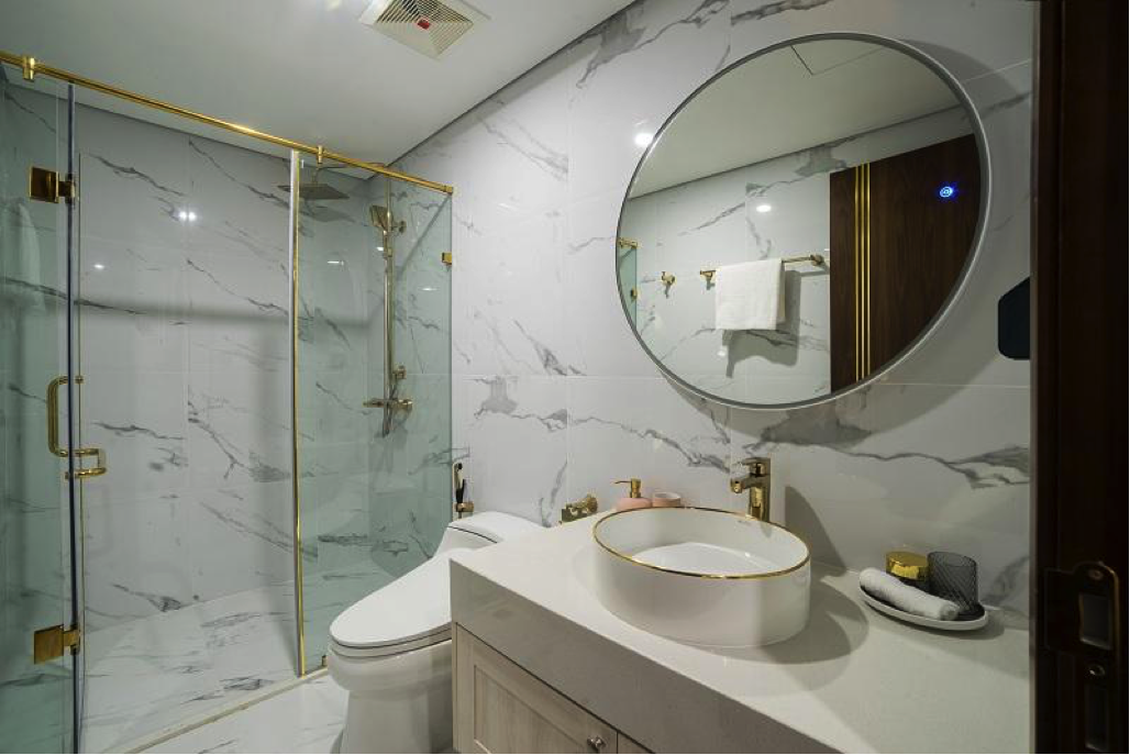 Sàn nhà và tường phòng tắm được ốp đá hoa cương cao cấp cùng những chi tiết dát vàng sang trọng của nội thất Kohler như một lời nhắc nhở về những đam mê nuông chiều bản thân của con người