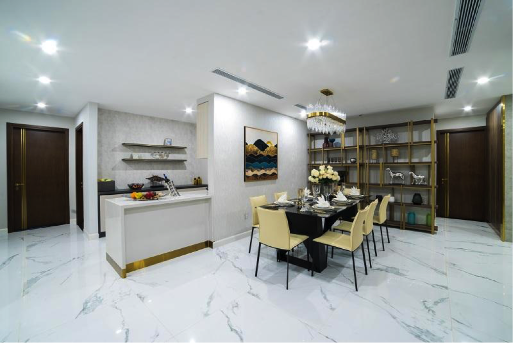 Khu bếp và phòng ăn lại là không gian đầy quyến rũ mang sắc màu trung tính trang nhã với trần cao và những bức tường trang hoàng ấn tượng, hứa hẹn những bữa tối thịnh soạn, ấm cúng để gia đình sum họp…