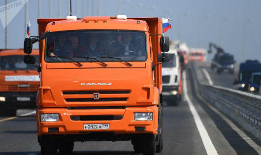 | Tổng thống Nga Putin đã đích thân lái chiếc xe tải Kamaz thực hiện chuyến đi đầu tiên trên công trình xây dựng mới. Tổng thời gian qua cầu là 16 phút. |
