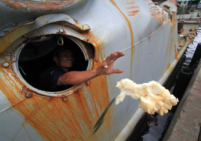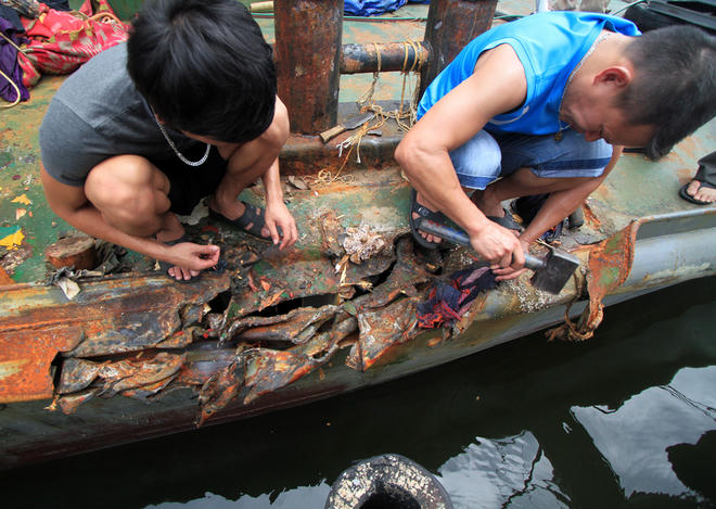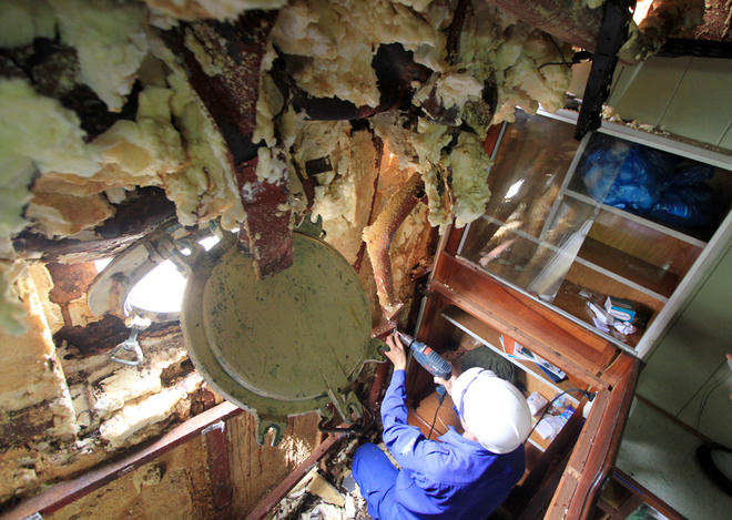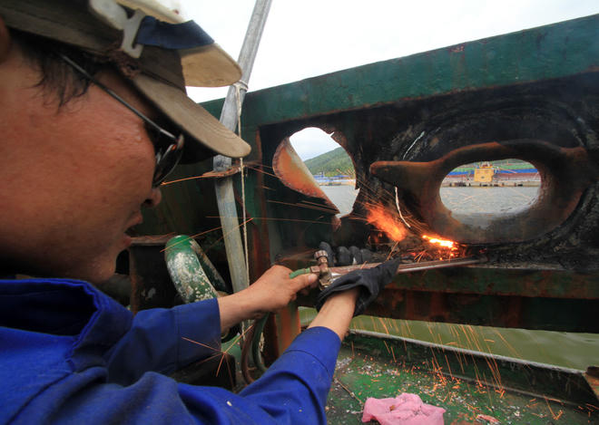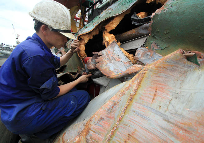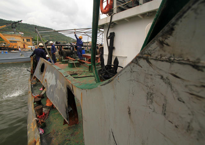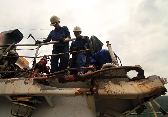 Các công nhân đóng tàu đang khẩn trương cắt những bộ phận hư hỏng, dùng cẩu đưa lên bờ để tiếp tục sửa chữa. Thời gian hoàn thành sửa chữa dự kiến kéo dài một tuần.