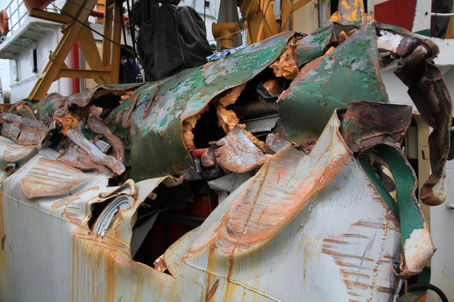 Vết đâm bên mạn phải khiến một dải thành tàu bị đứt lìa, móp méo, cầu thang phía ngoài dẫn lên cabin bị cong vẹo.