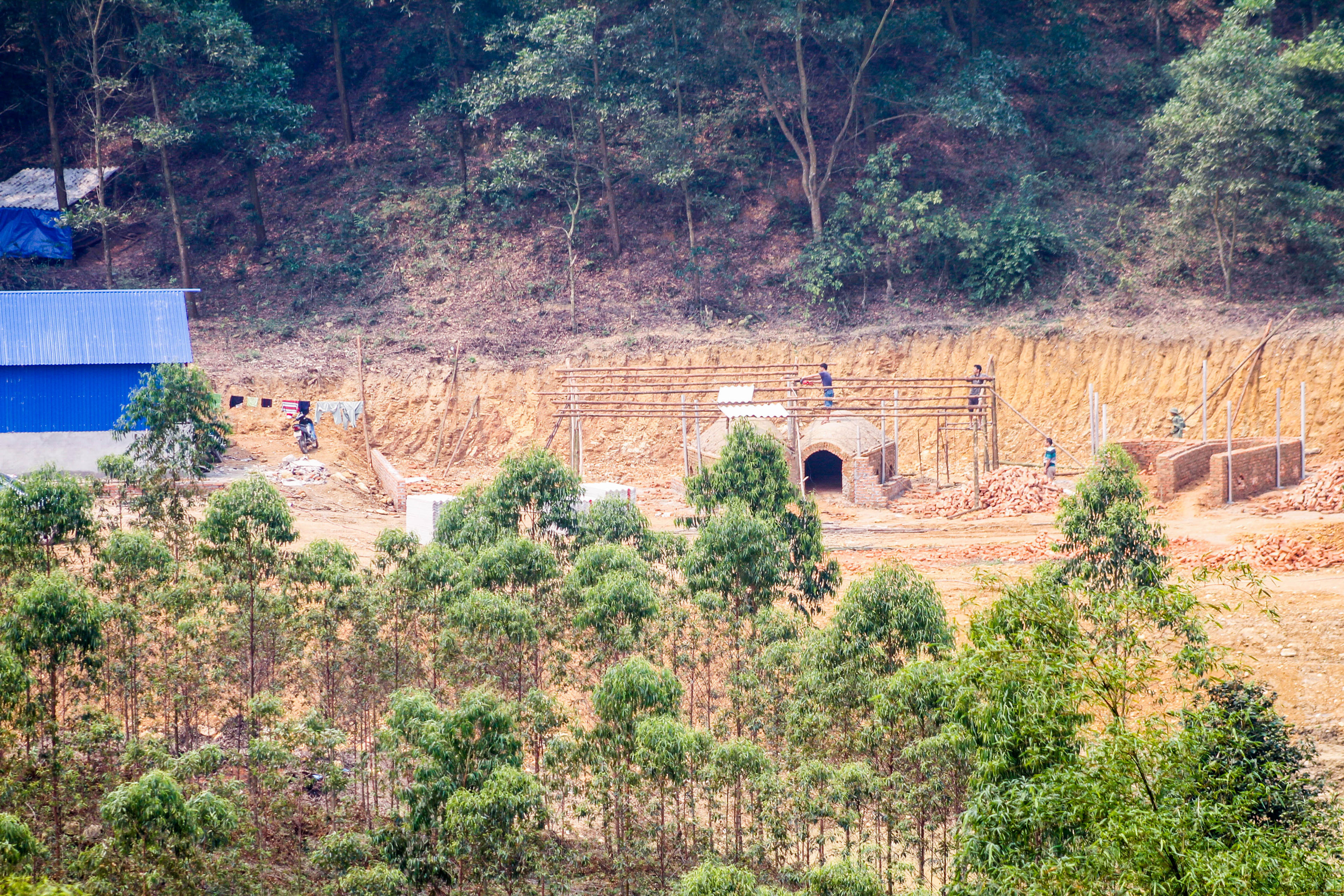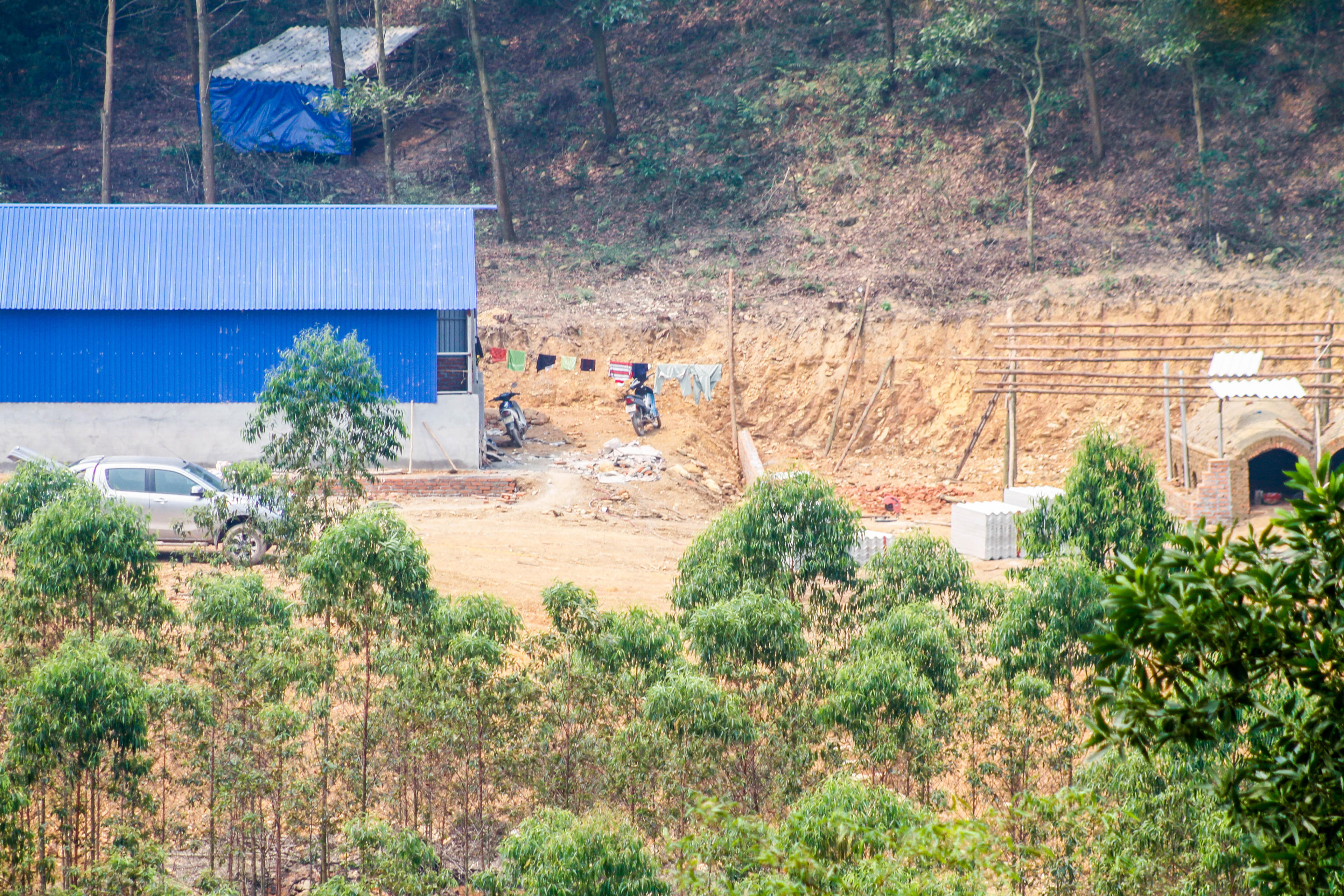| Góc phơi quần áo và các công trình sinh hoạt của những người xây đựng nhà xưởng trong rừng phòng hộ trên núi Đá Bia |