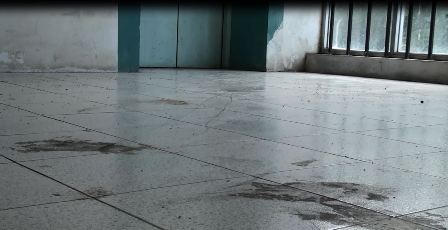 Phía trong, hầu hết sàn, sảnh, cầu thang các tầng đều bẩn thỉu, tường trốc lở, sơn tường bị ẩm rơi lỗ chỗ. Rác thải vứt đầy các bồn phía ngoài hiên các tầng 3,4. Sàn tầng 1 ngay cửa chính vào bị sụt võng, gạch lát nền nứt gãy.