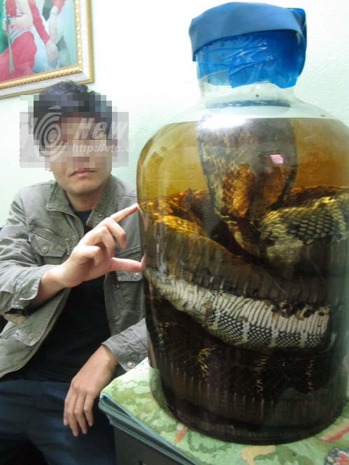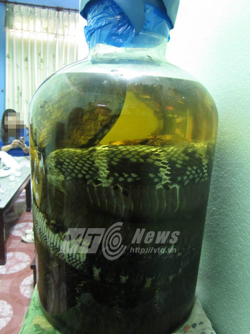 Con mãng xà này nặng 23kg, được ông K. mua được từ một đầu nậu rắn với giá 100 triệu đồng. Ông đã xây hẳn cái bể thả đại hổ chúa để nuôi cho mọi người tham quan, nghiên cứu nhưng tiếc là nó rất khó nuôi. Dù đã dùng đủ mọi cách, con rắn này vẫn không chịu ăn, chết dần chết mòn trong chuồng nuôi. Ông đành quyết định… làm thịt nó. Riêng bộ lòng, xào được mấy món, đủ một mâm nhậu cho mấy người. Phải mất tới 100 lít rượu mạnh để rửa sạch mãng xà. Thêm ngàn lít nữa đổ đầy bể, ngập thân rắn.