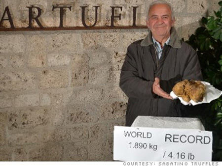 Cây nấm Truffle với kích thước kỷ lục 4.16 lb (tương đương 1.890kg) này đã được một thợ săn nấm của Sabatino Truffles tìm thấy khi đi săn cùng với một chú chó mới được huấn luyện.