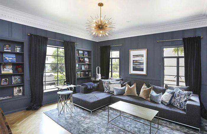 Phòng sinh hoạt chung được sơn màu xám sang trọng với giá sách gắn sẵn và đèn chiếu sáng có thiết kế riêng.