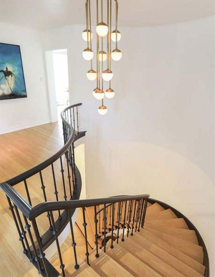 Trong lối vào của ngôi nhà, một cầu thang xoắn ốc trang nhã dẫn lên tầng hai.