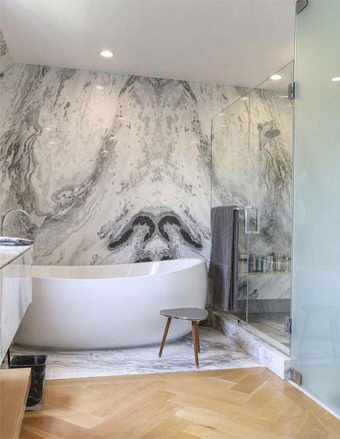 Đá cẩm thạch sang trọng bao quanh bồn ngâm hình bầu dục.