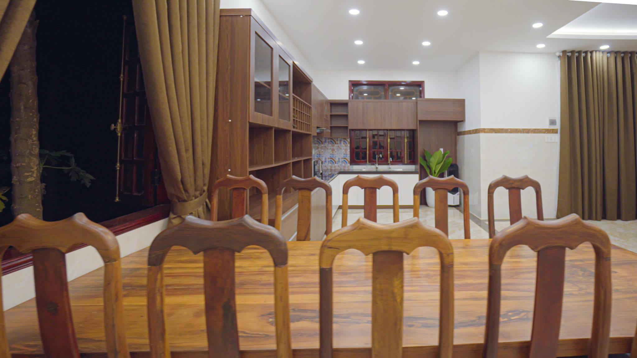 Cô chọn một chiếc bàn gỗ to làm nơi gia đình ăn uống. Tuy nhiên, người đẹp cho hay đây không phải là bàn mà cô đặt làm. Vì trước đó có người đặt làm nhưng không lấy, cô đến tiệm mộc, thấy thương chủ tiệm nên đã mua về dùng chứ không đặt cái mới.
