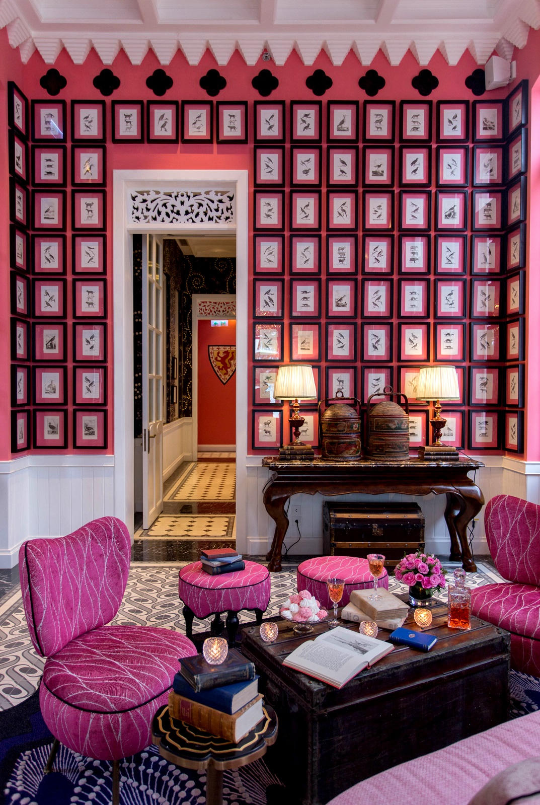 Nội thất Pink Pearl được bài trí tinh tế, cầu kỳ trên nền tone hồng chủ đạo, là sự kết hợp hoàn hảo của lối kiến trúc hiện đại và những nét văn hóa đặc trưng bản địa. Bill Bensley kỹ lưỡng chọn lọc từng bức tranh treo tường đến việc đưa những họa tiết trang như chú chó Phú Quốc, chim hồng hạc, hoa văn cỏ cây, bộ lông rực rỡ của chim công… để tạo nên không gian vừa sang trọng, lịch lãm nhưng cũng hết sức gần gũi với thiên nhiên.
