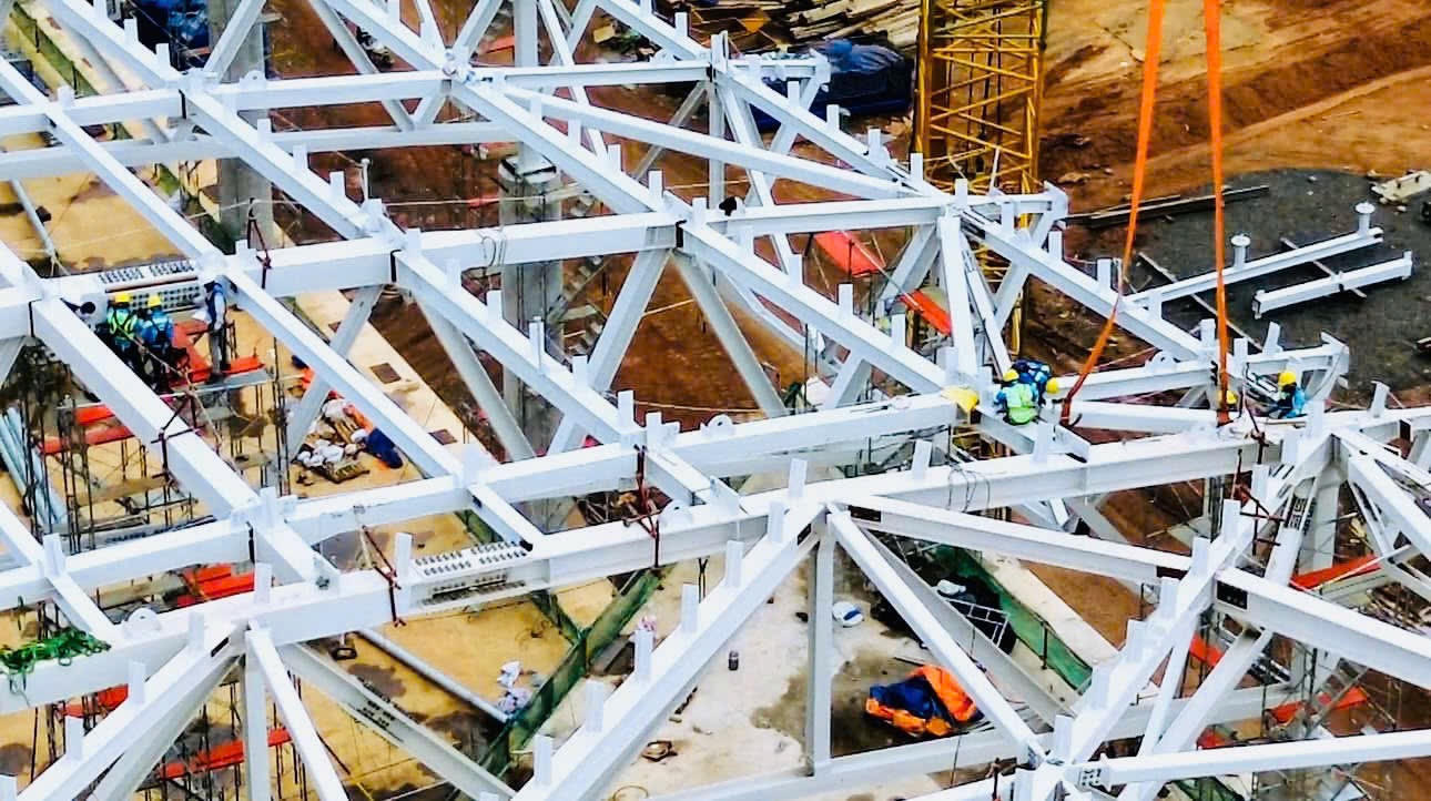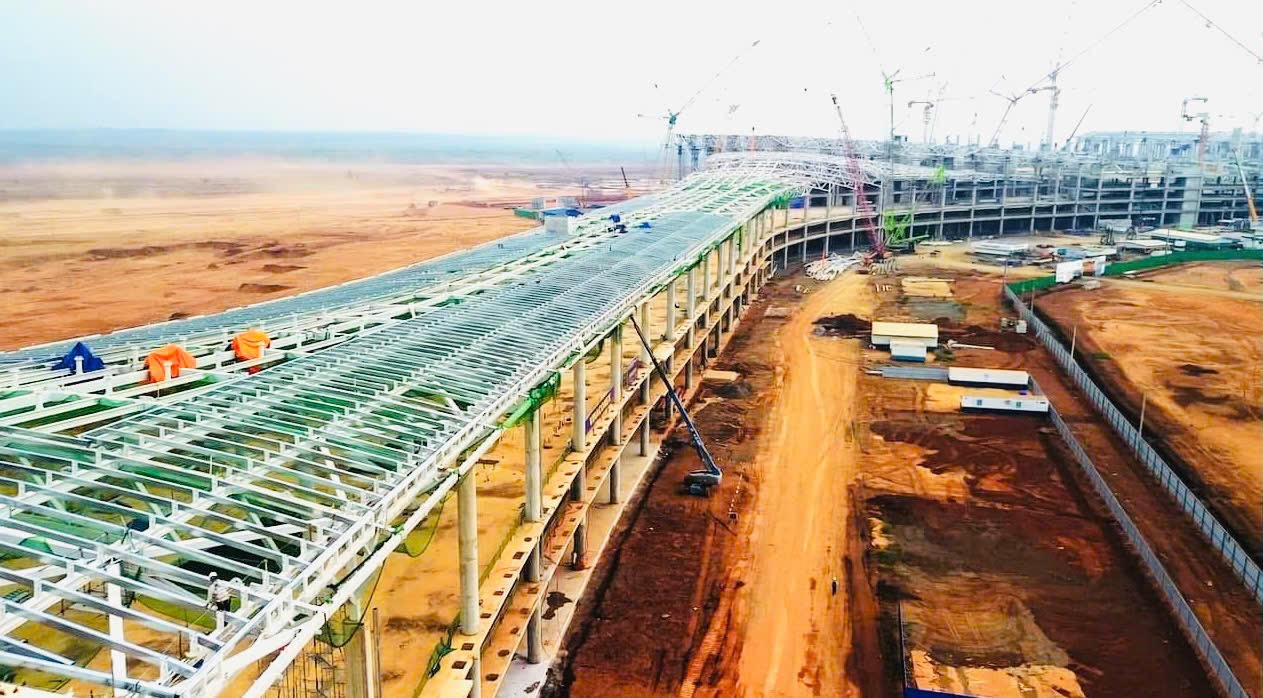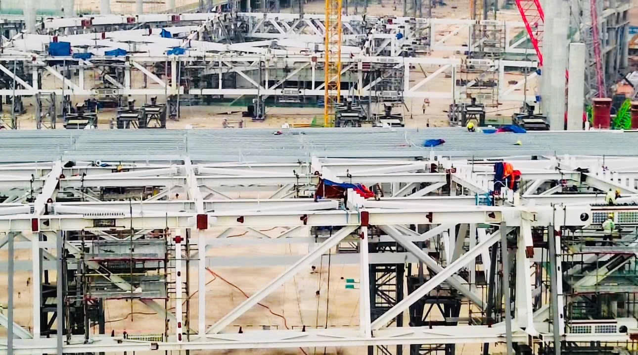 Được khởi công ngày 31/8/2023, đến nay, sau hơn một năm, công trình đang được đẩy nhanh tiến độ, liên danh nhà thầu đang huy động tối đa nhân, vật lực để thi công lắp đặt kết cấu mái khung thép nặng khoảng 32.000 tấn.