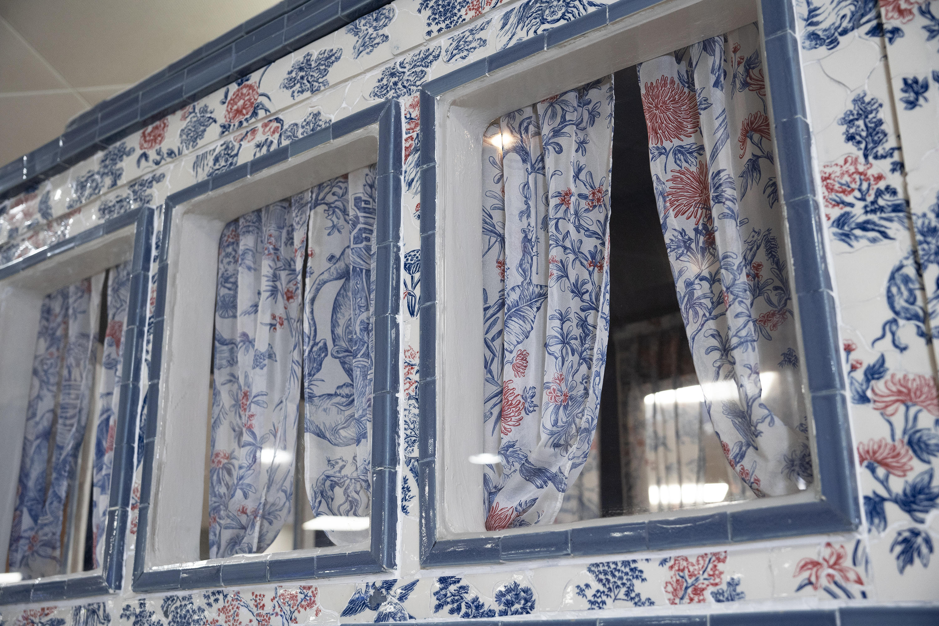 Sự giao thoa giữa tranh dân gian Việt Nam cùng kỹ thuật dệt vải lâu đời Toile de Jouy thanh lịch và tinh tế của văn hóa Pháp (một loại vải có nguồn gốc từ thế kỷ XVIII thường miêu tả những khung cảnh thiên nhiên nên thơ) đã trở thành nguồn cảm hứng để nghệ sĩ Xuân Lam thể hiện từng nét vẽ tỉ mỉ, với kỹ thuật đan chéo đặc trưng, tạo nên nét độc đáo cho khu vườn dân gian Việt – Pháp.