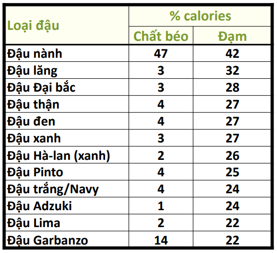Bảng thống kê hàm lượng đạm và chất béo trong các loại đậu.