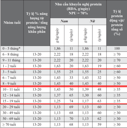 Bảng thống kê Nhu cầu đạm khuyến nghị của Bộ Y tế và Viện Dinh dưỡng năm 2016.