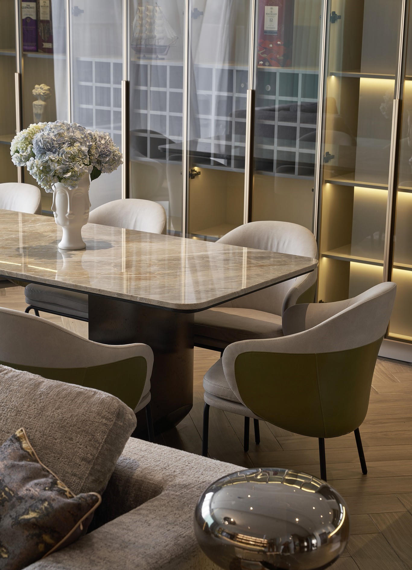 Toàn bộ không gian phòng khách được thiết kế với gam màu trắng, ghi xám và xanh tạo sự sang trọng và huyền bí riêng biệt cho căn hộ. |
