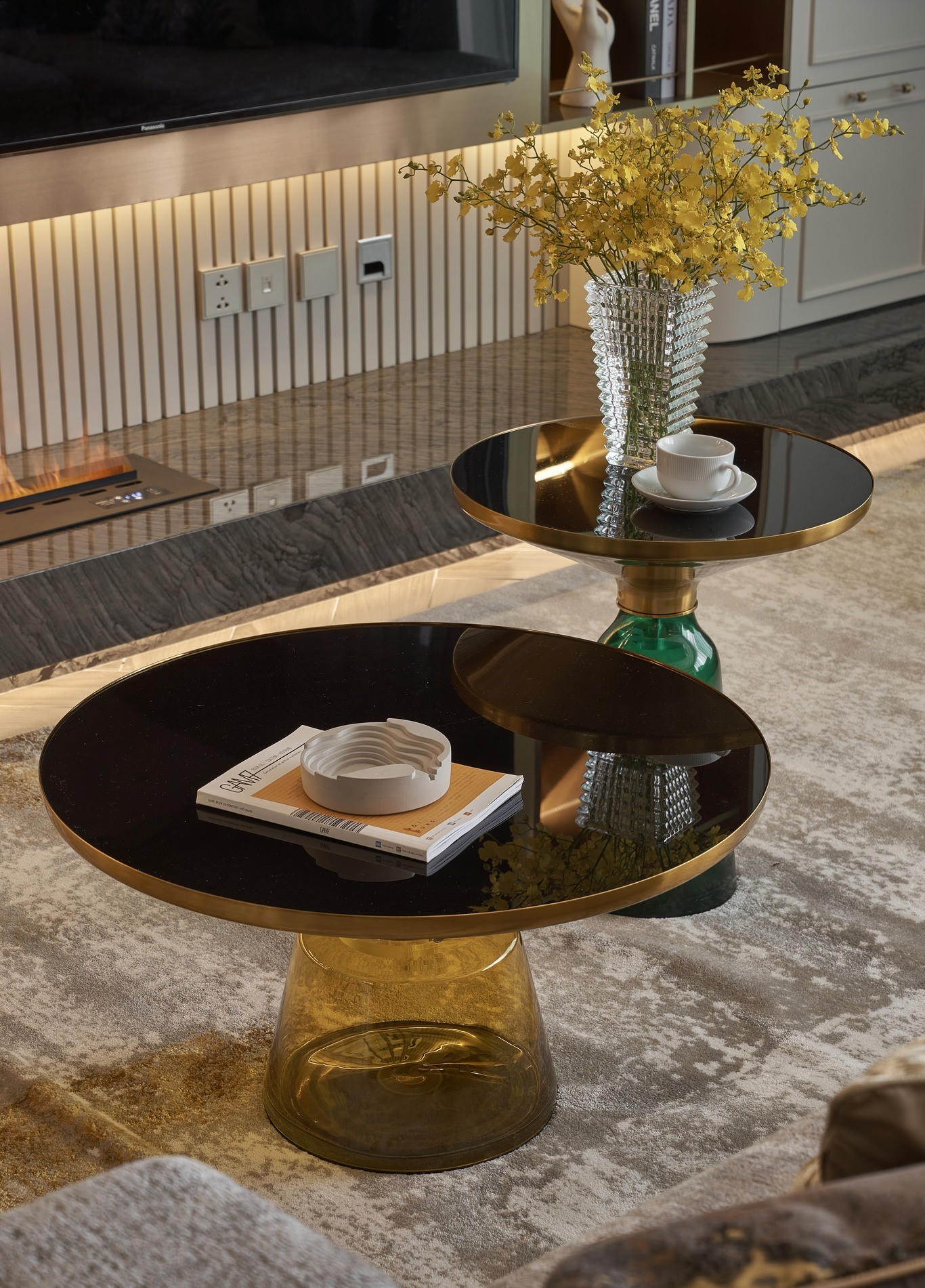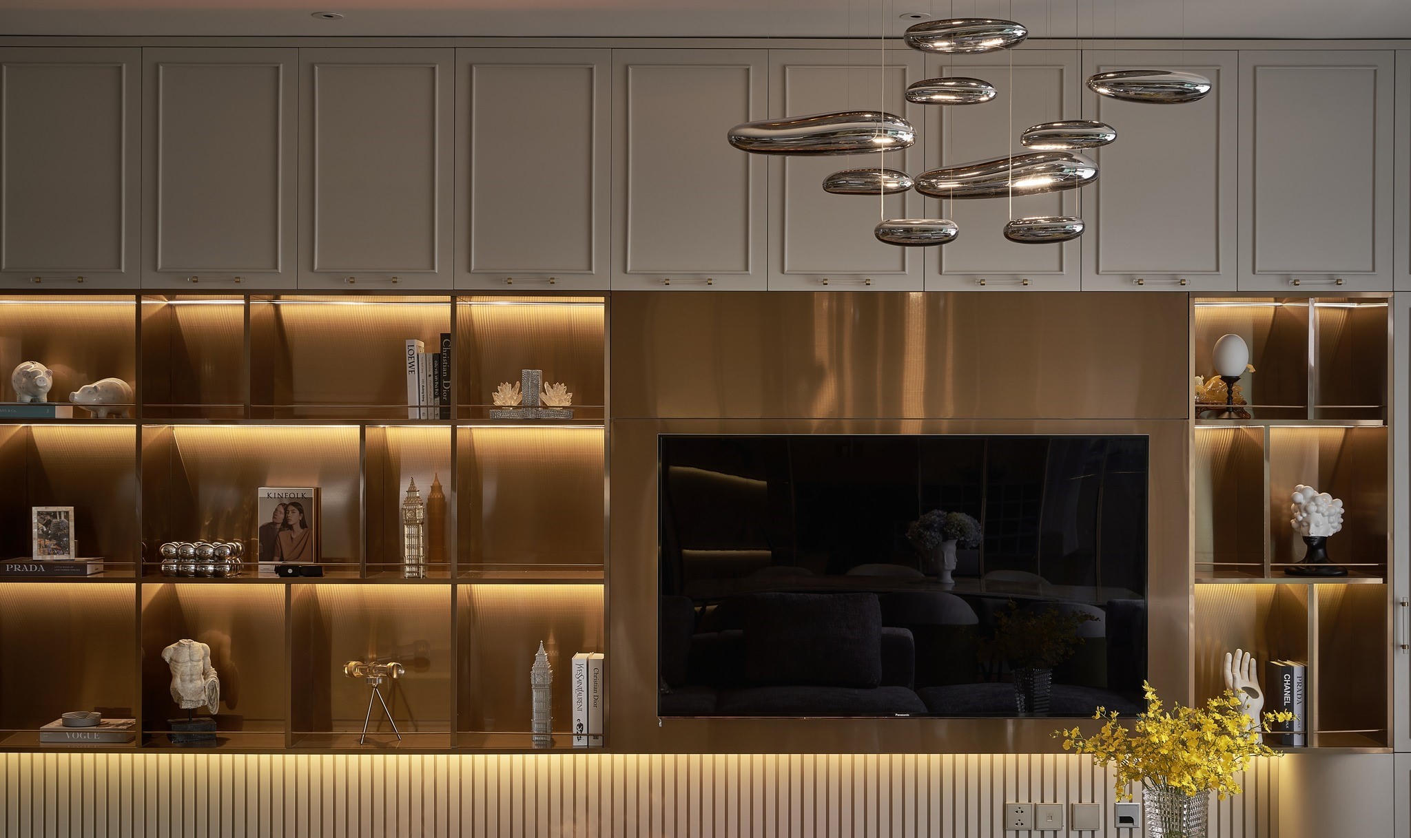 Điểm nhấn của phòng khách là chiếc TV màn hình phẳng và hệ thống đèn thả đặc biệt với thiết kế là những viên sỏi. |