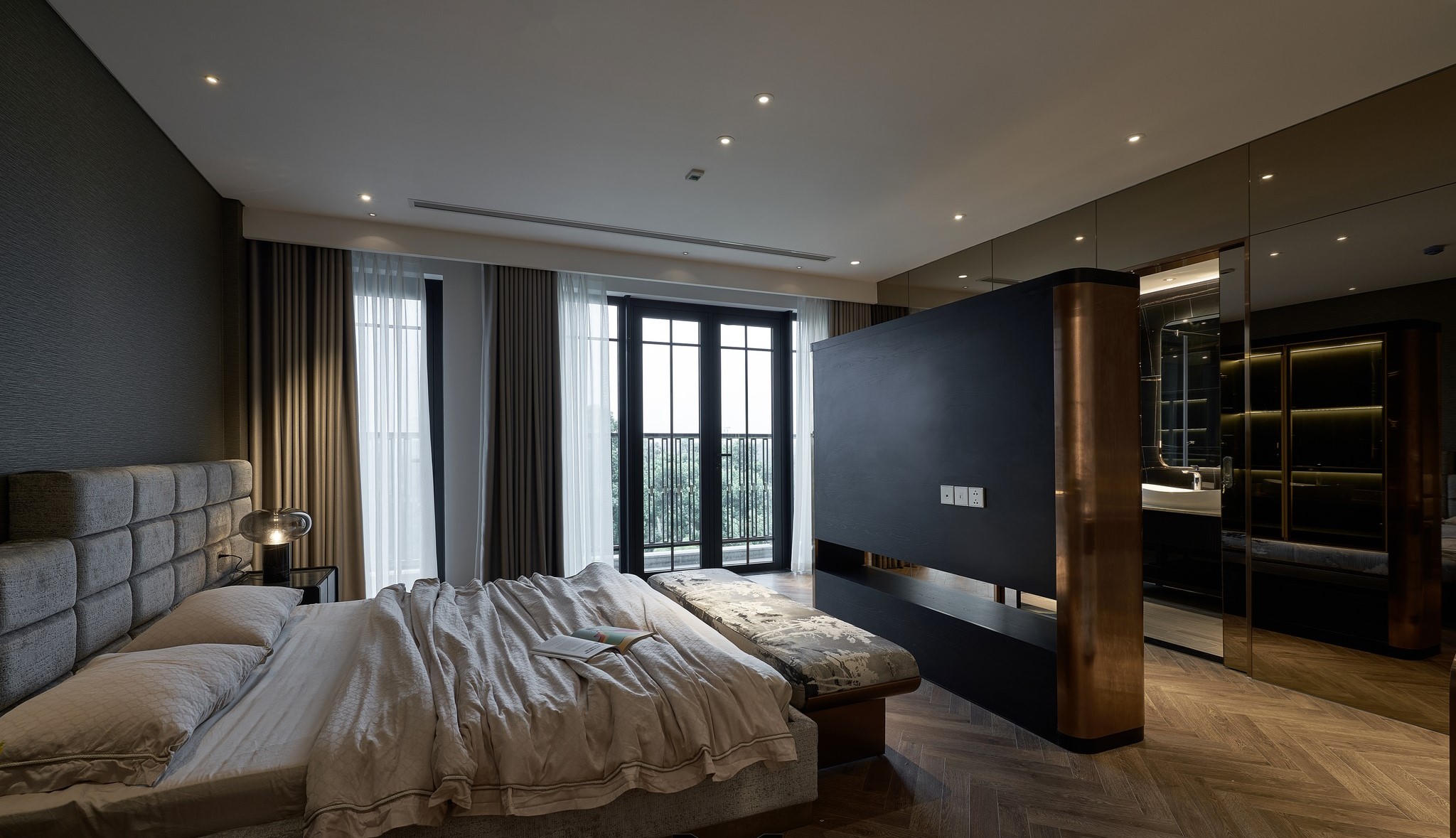 Bên trong phòng ngủ với thiết kế hệ vách đầu giường thiết kế bất đối xứng. |