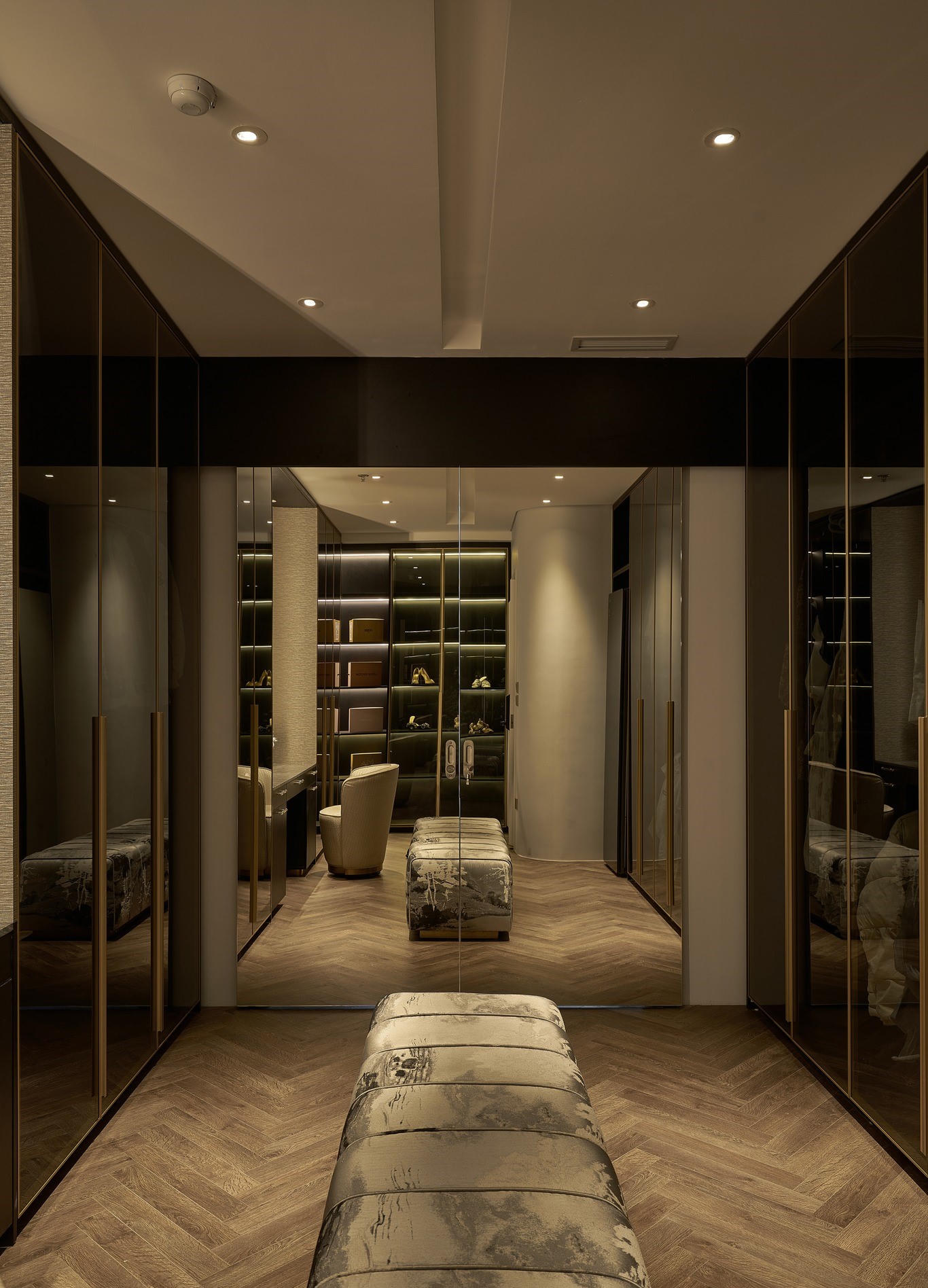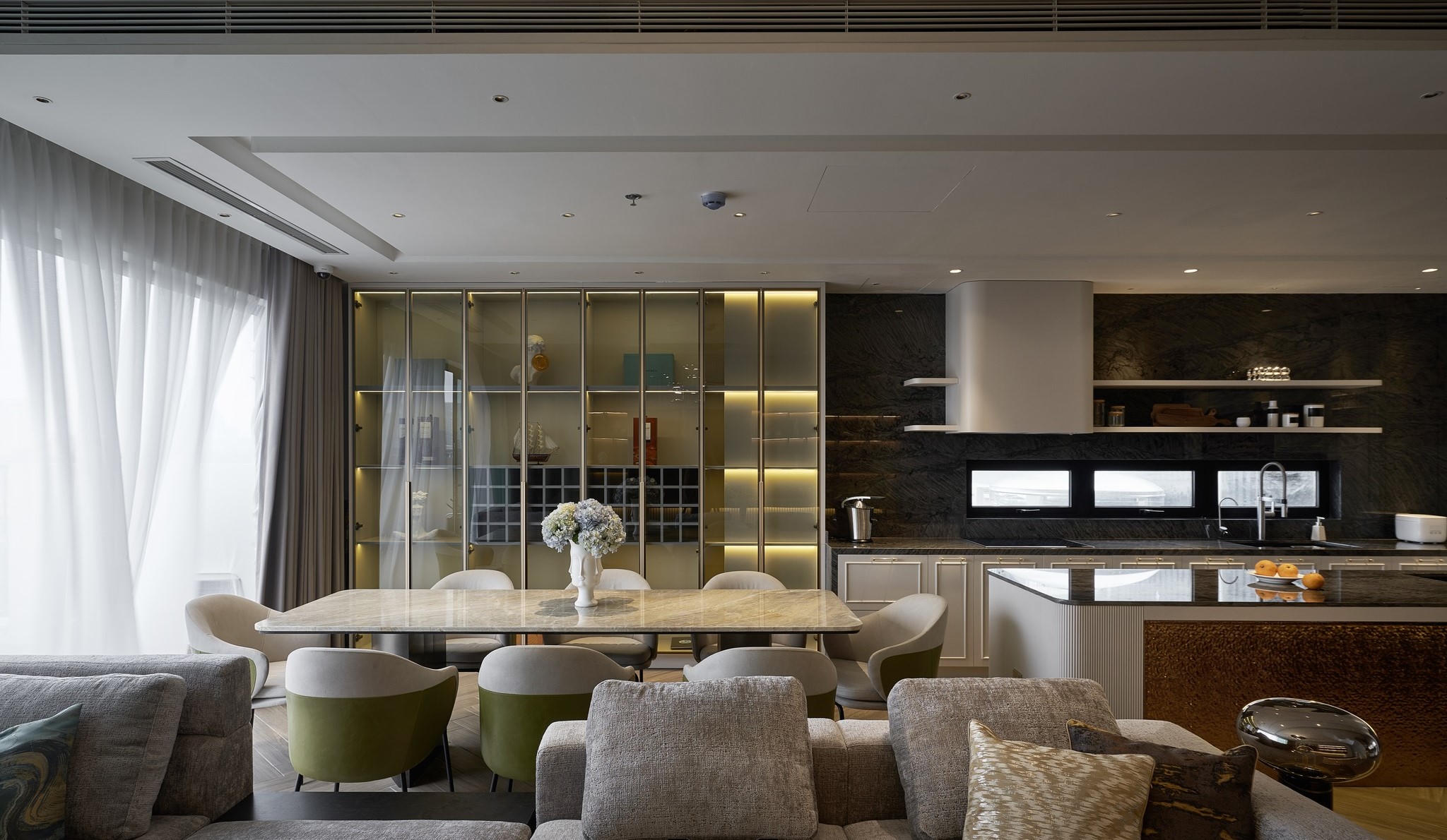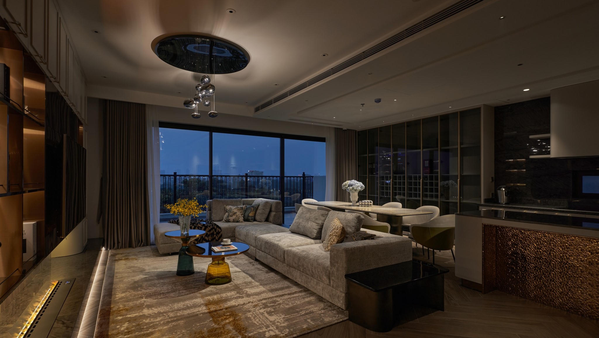 Theo kiến trúc sư Nguyễn Minh, căn hộ Duplex này mang phong cách hiện đại pha thêm nét bán cổ điển từ các chi tiết thiết kế nội thất nhẹ nhàng, khiến cho không gian chở nên mềm mại hơn. Toàn bộ khu vực phòng khách, bếp, phòng ăn nằm ở tầng 7 được thiết kế liên thông và liền mạch nhằm kết nối không gian sinh hoạt tối đa. Các hệ kệ và tủ được bố trí liền mạch và liên tục nhằm tăng tính kết nối không gian.