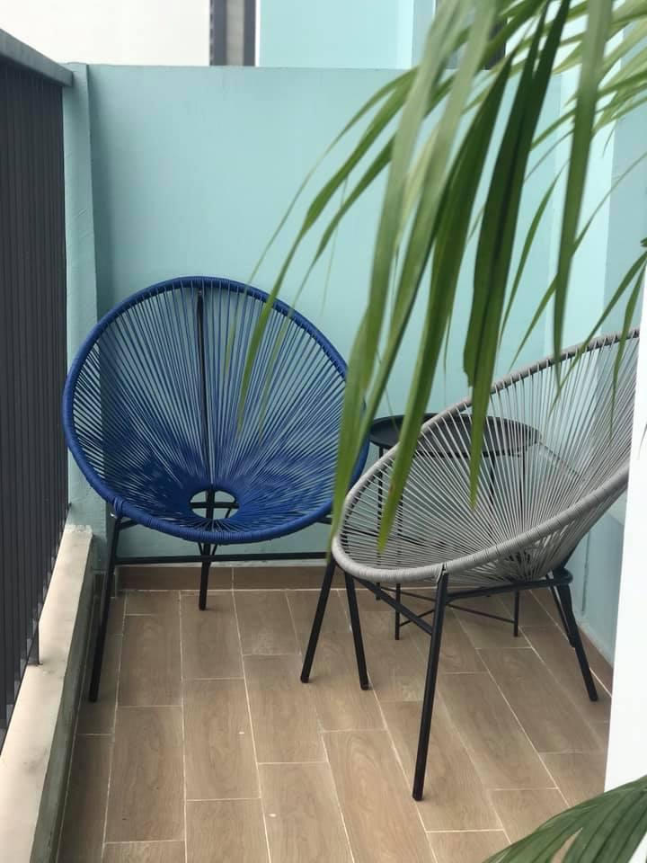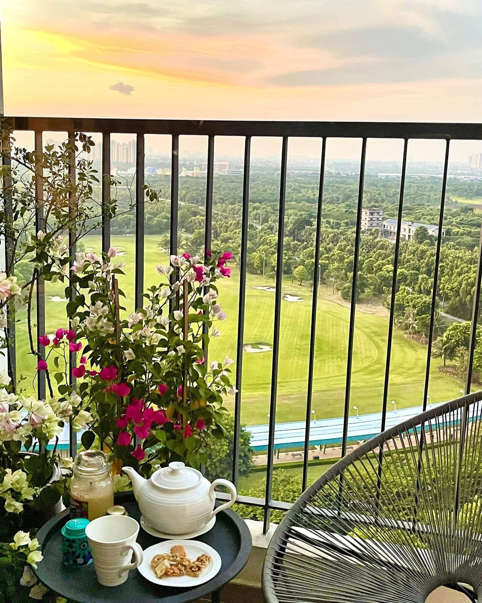 Chị Thủy chia sẻ, "đặc sản" ở khu đô thị chị sống là cây xanh nên ban công chỉ trồng một vài cây cảnh nhỏ cho sinh động, còn đâu chị lấy diện tích làm nơi uống trà, hóng mát.