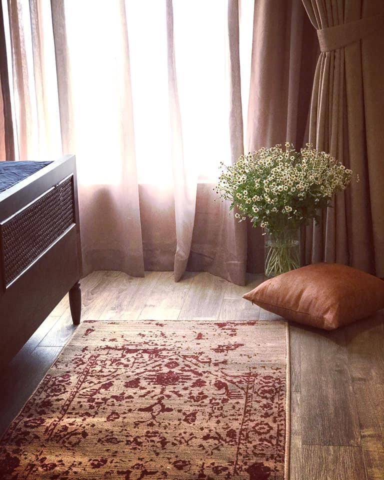 Chiếc thảm đặc trưng của đất nước yên bình này kết hợp màu sắc nâu trầm của nội thất tạo ra sự tĩnh tại, thư thái.