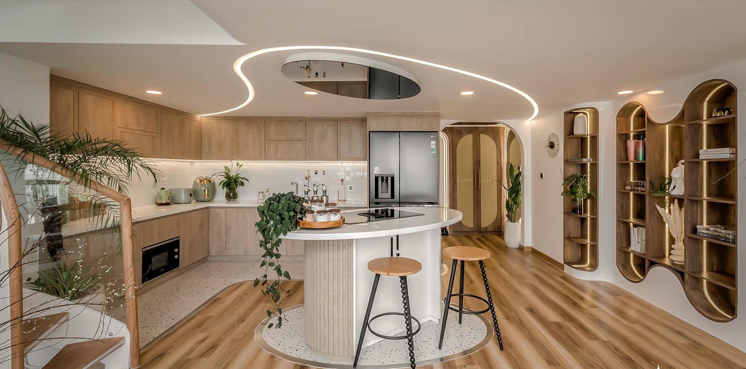 Thông với phòng khách là khu bếp. Bếp được thiết kế với tông màu be và gỗ sáng, toàn bộ bếp nấu được tách riêng, đặt trên bàn đảo hình bầu dục. Với cách bố trí này, gia chủ có thể giao lưu với mọi người ngoài phòng khách một cách dễ dàng.