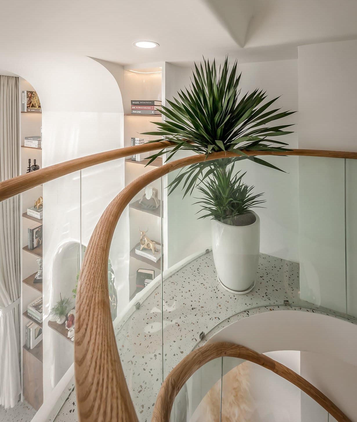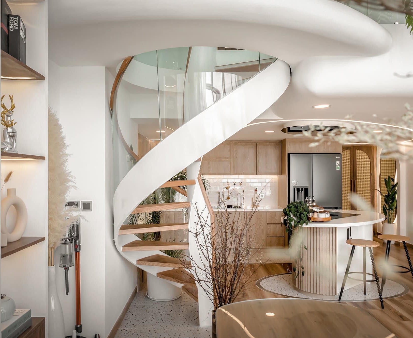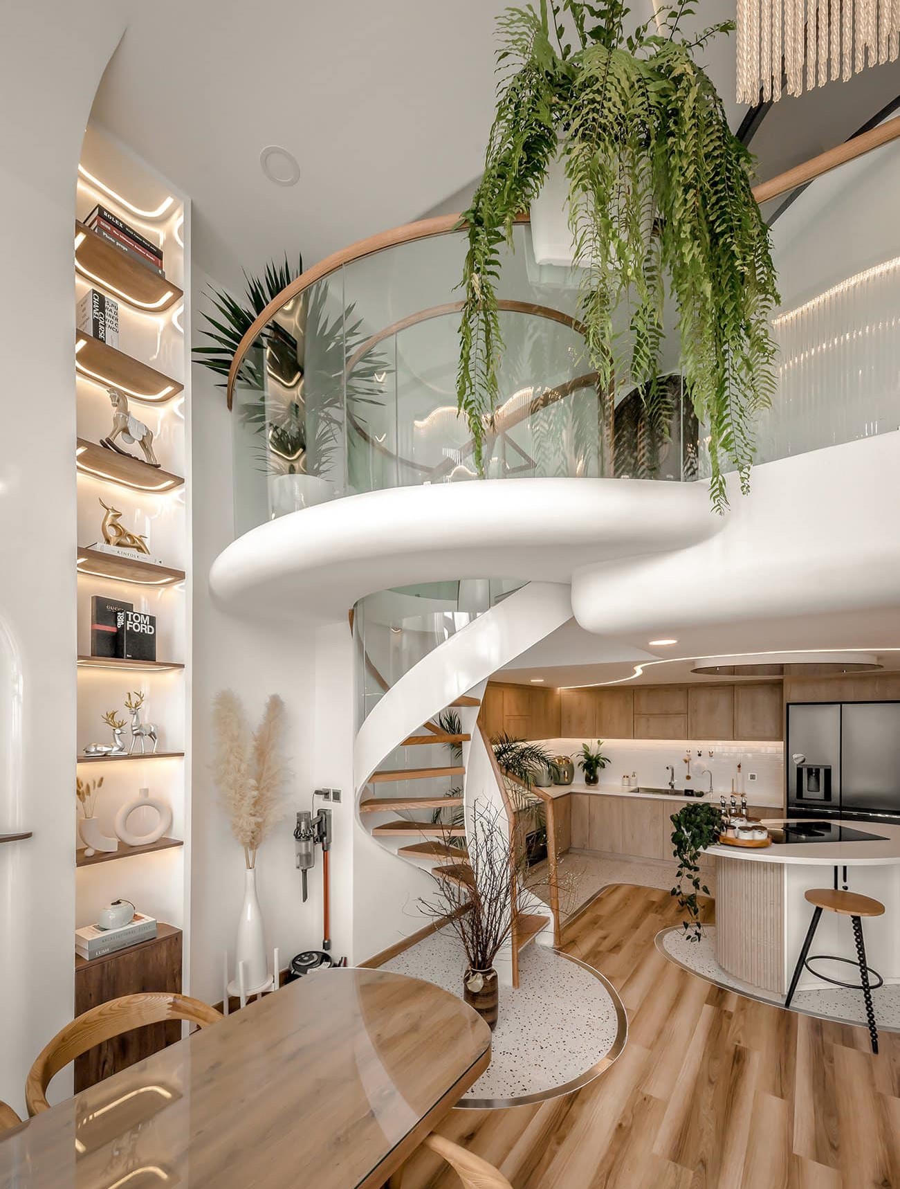 Căn hộ Duplex nổi bật với thiết kế đường cong và tông màu trắng sang trọng
