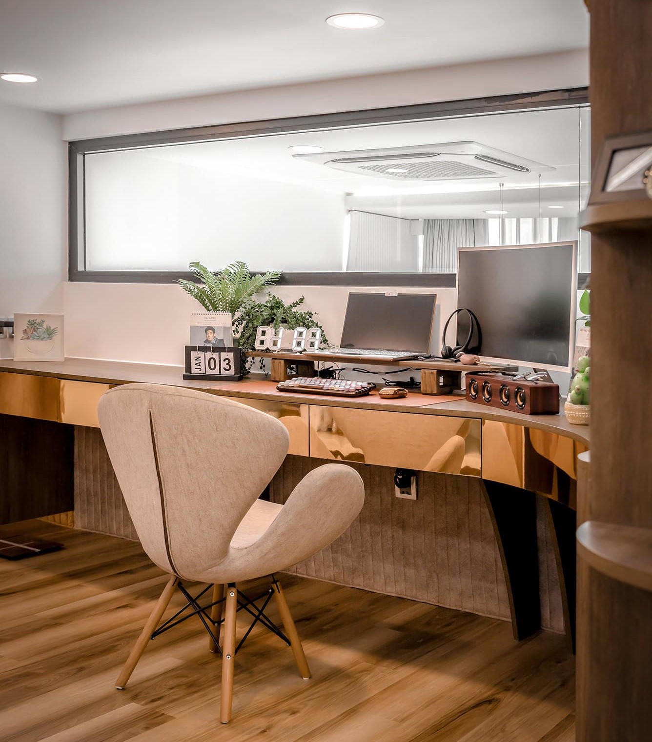 Từ ngoài cửa chính nhìn thẳng vào là không gian phòng khách và sinh hoạt chung với hệ thống cửa kính rộng khiến bố cục căn phòng trở nên thoáng đãng hơn bên cạnh đó là thiết kế nội thất, bàn và đèn được thiết kế theo các đường cong tự nhiên bất đối xứng để xóa đi cảm giác ngăn chia góc cạnh thường thấy trong các căn hộ chung cư.