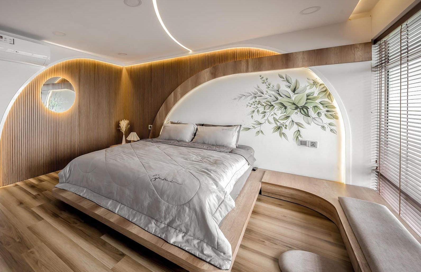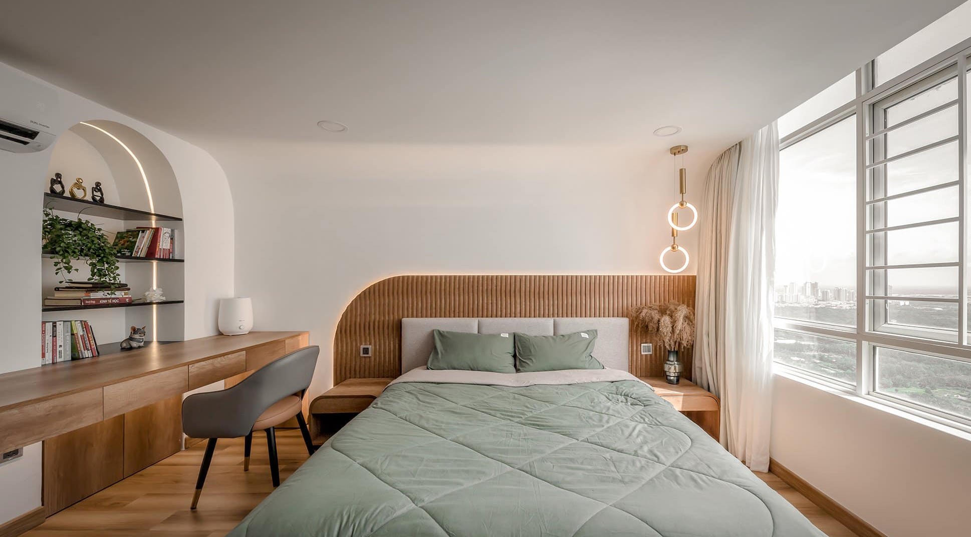 Bên trong phòng ngủ, được thiết kế với vòm đường cong, tông màu nâu sáng kết hợp với đồ gỗ tạo sự thân thiện và ấm cúng cho căn phòng. |