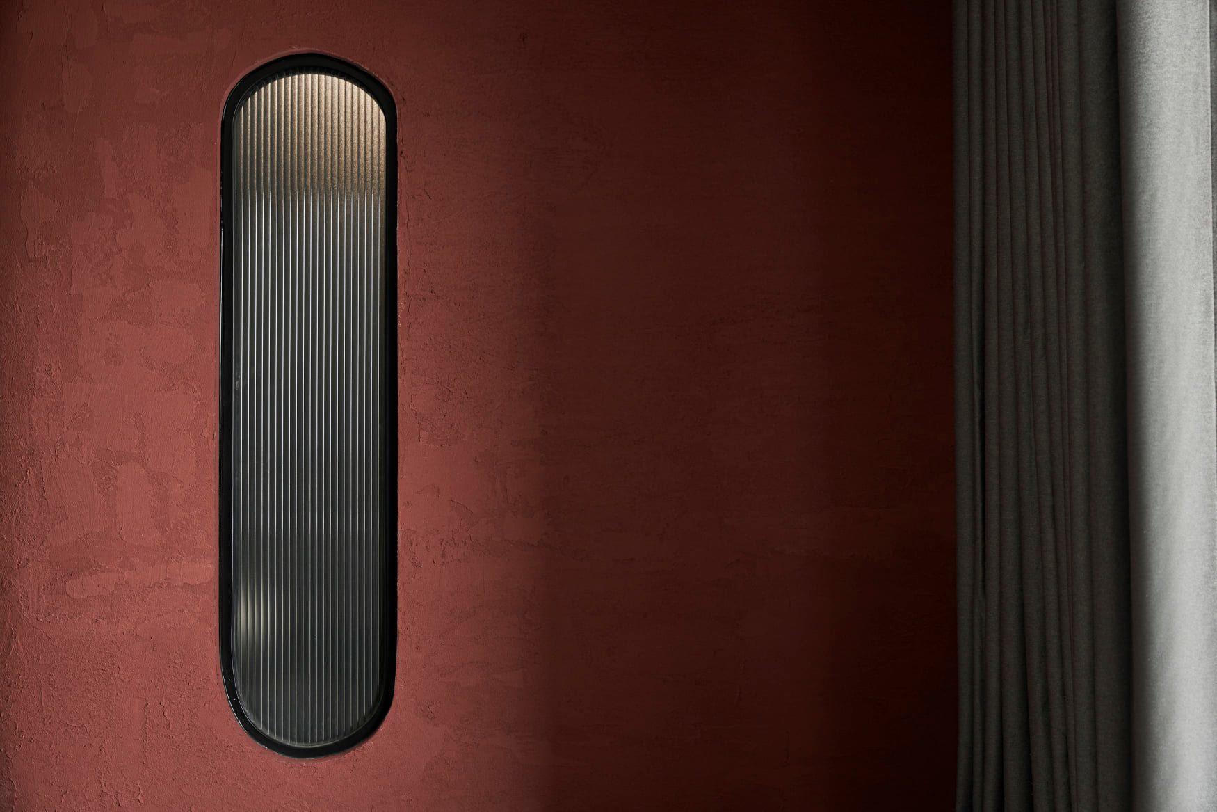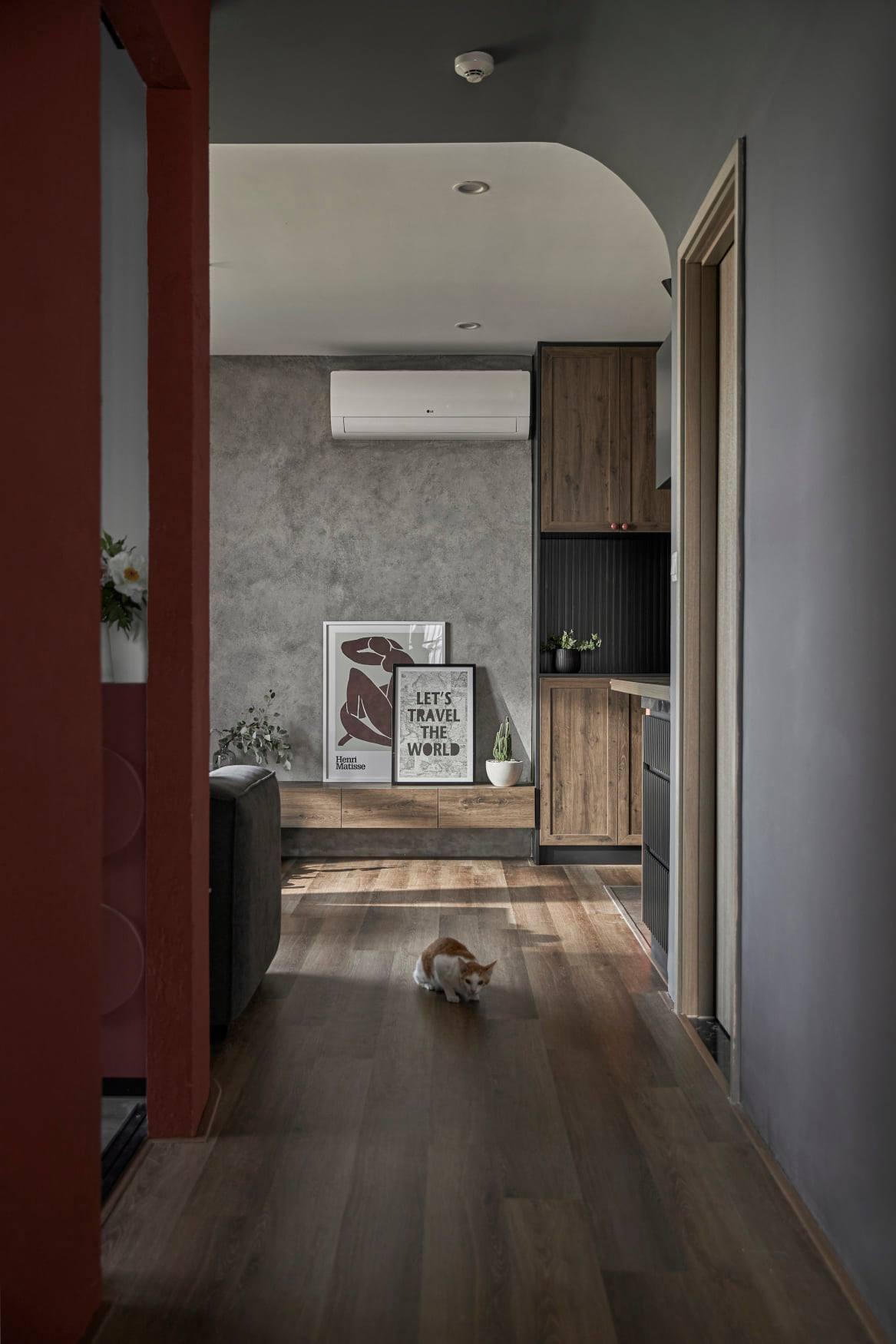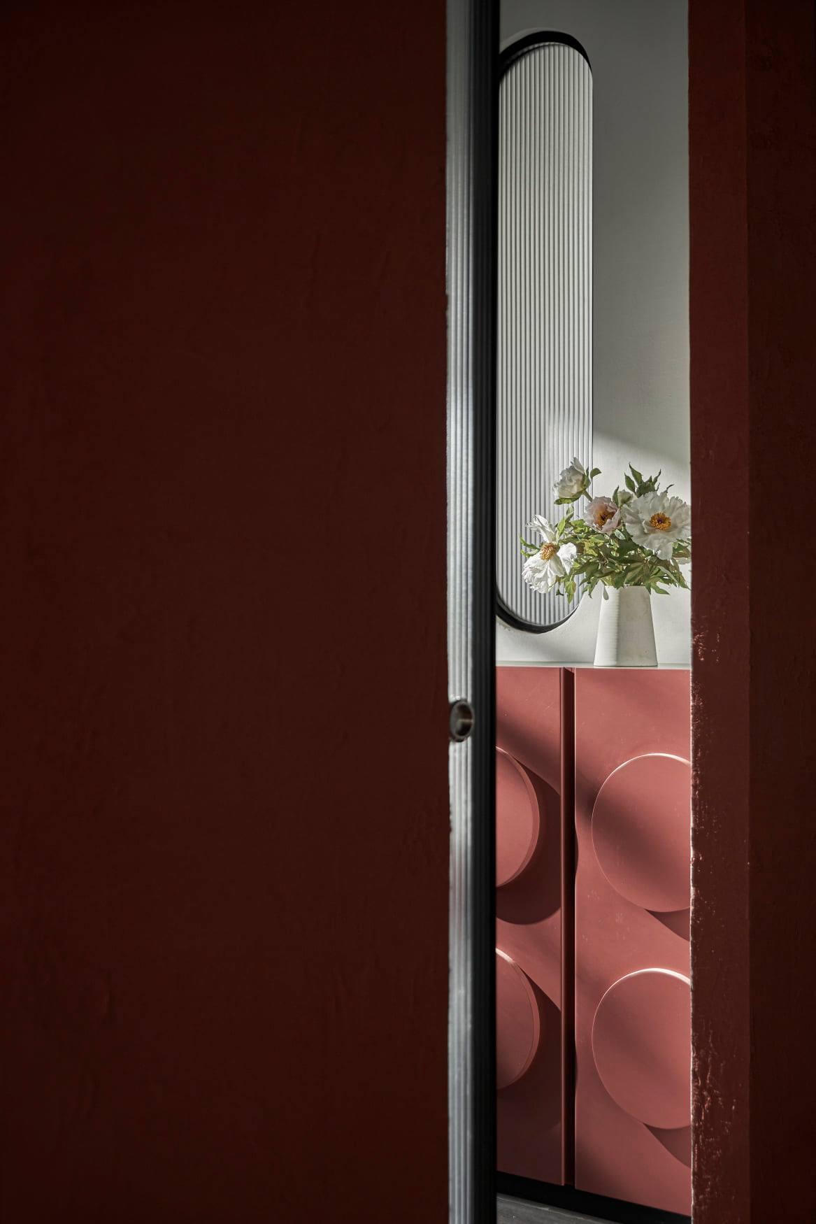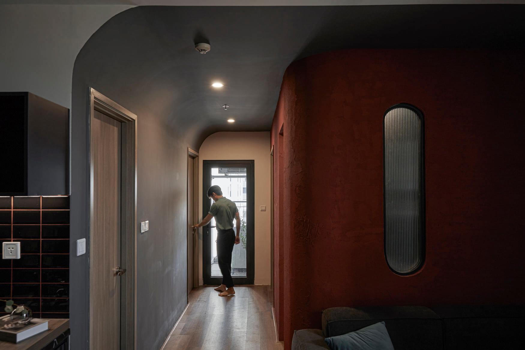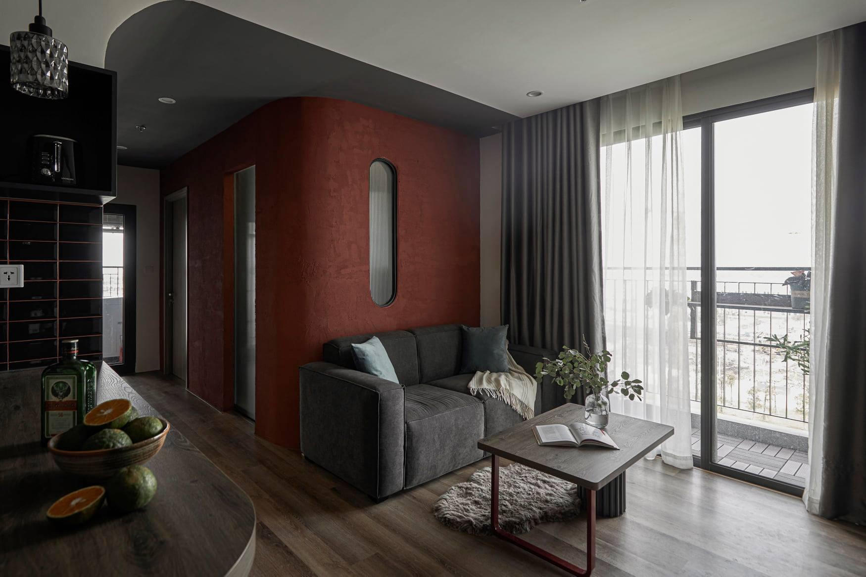 Tông màu đỏ đất tạo hiệu ứng thô mộc, ưu tiên sử dụng cho mảng tường bo cong phía sau sofa và kéo dài đến hết hết khoảng hành lang nhưng vẫn đồng nhất về độ tối.