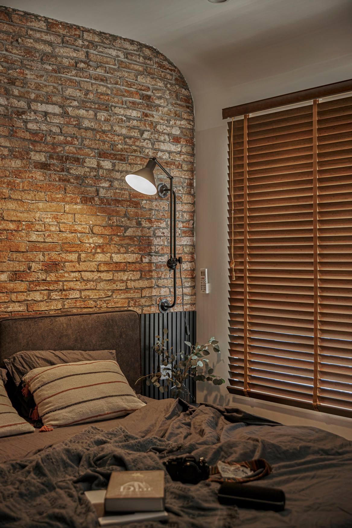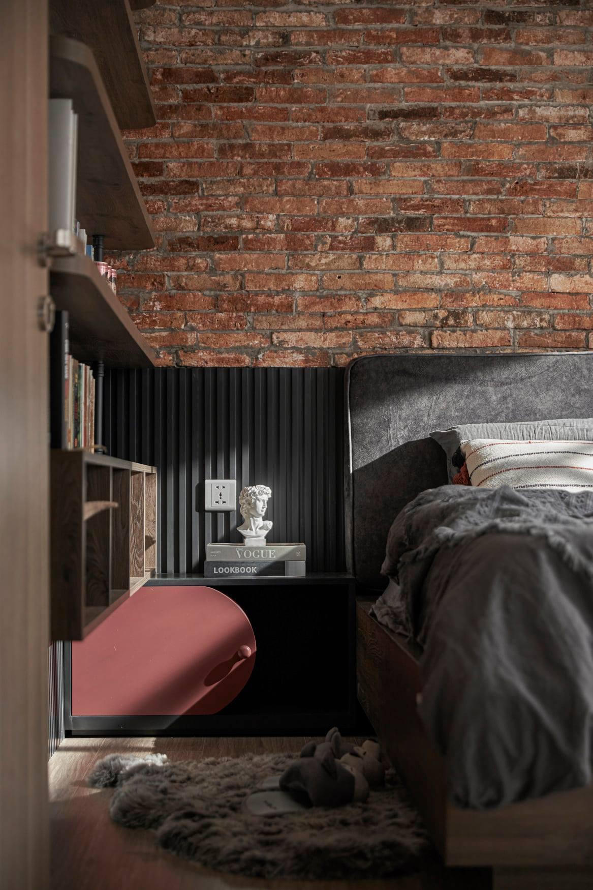 Tường gắn gạch đỏ, đèn ngủ sắt sơn đen đậm chất Loft.