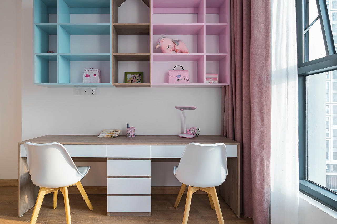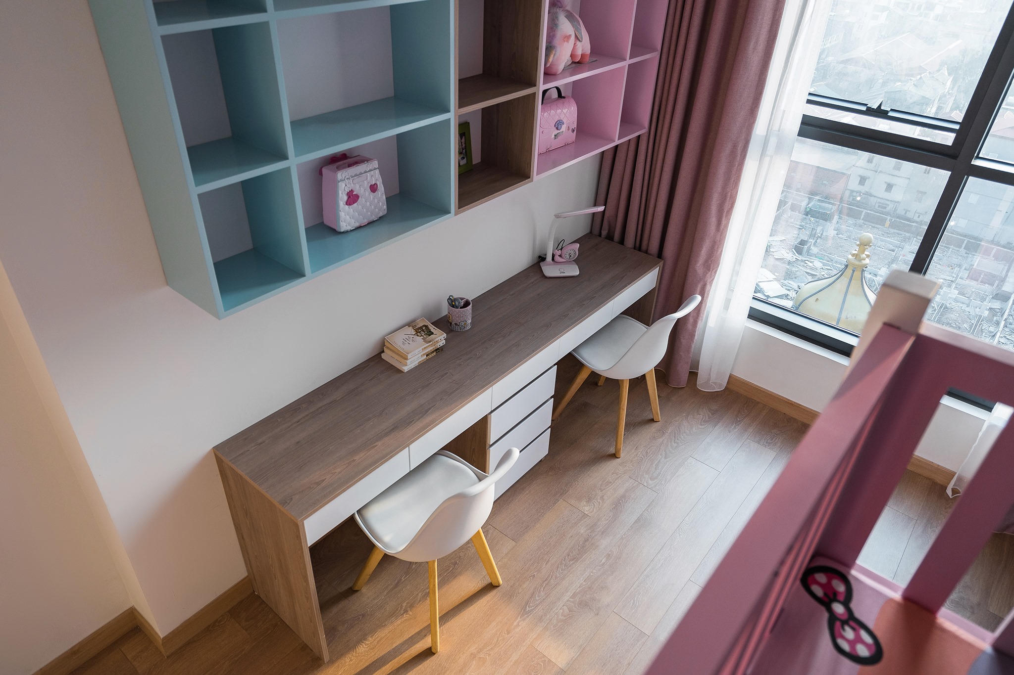 Góc học bình yên, đầy ánh sáng cho hai bé. |