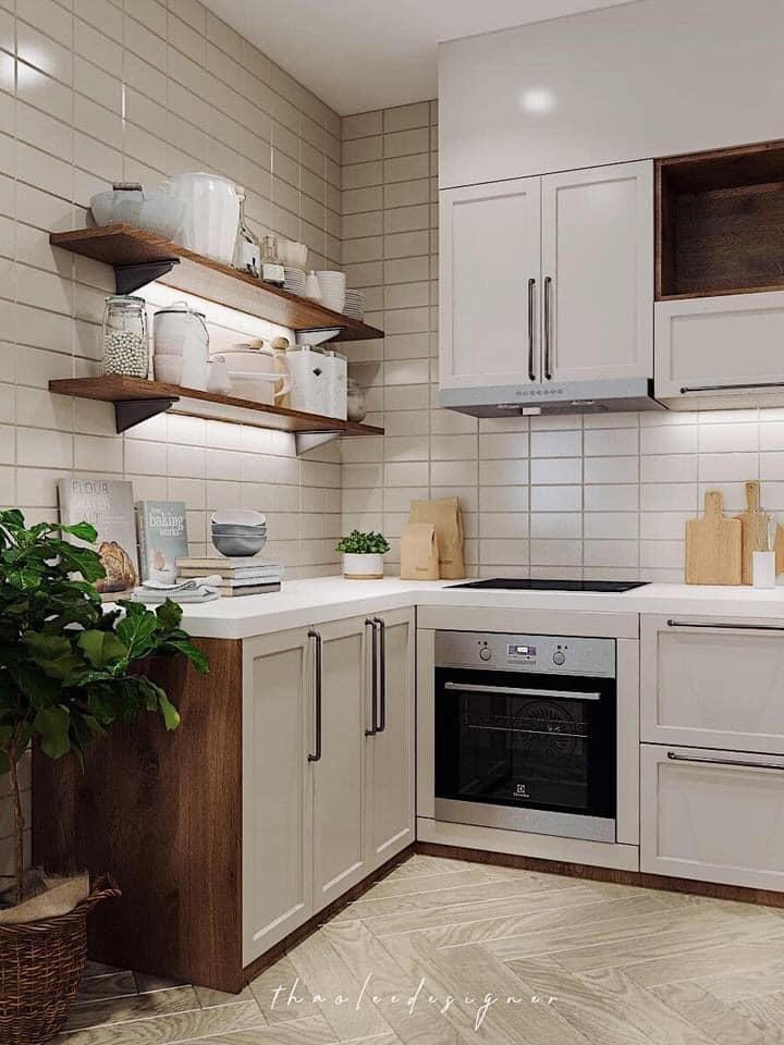 Gian bếp xinh xắn sử dụng gạch men ốp và tông trắng nhẹ nhàng. Kiến trúc sư kết hợp cả hệ tủ và kệ đồ giúp bếp thông thoáng hơn.