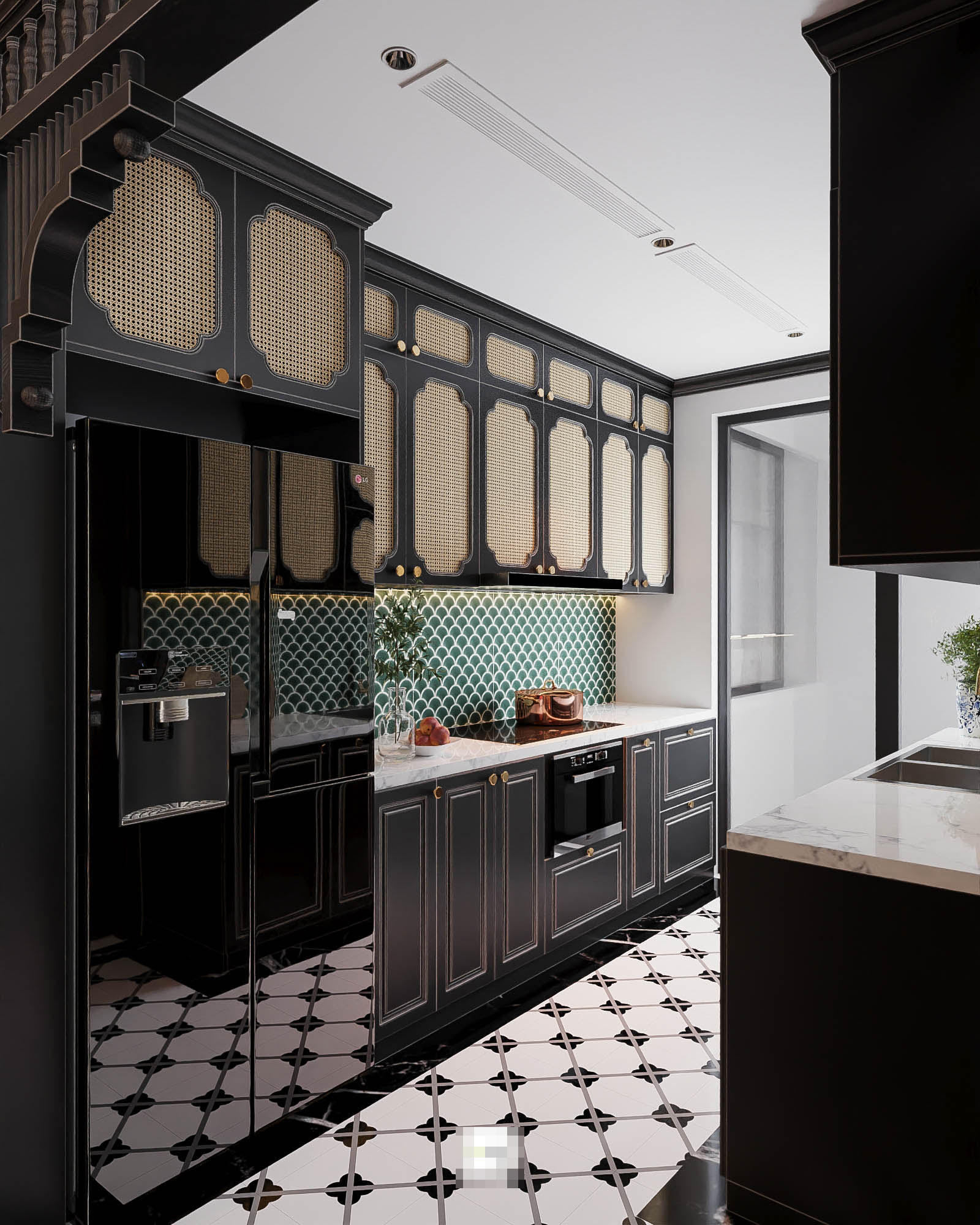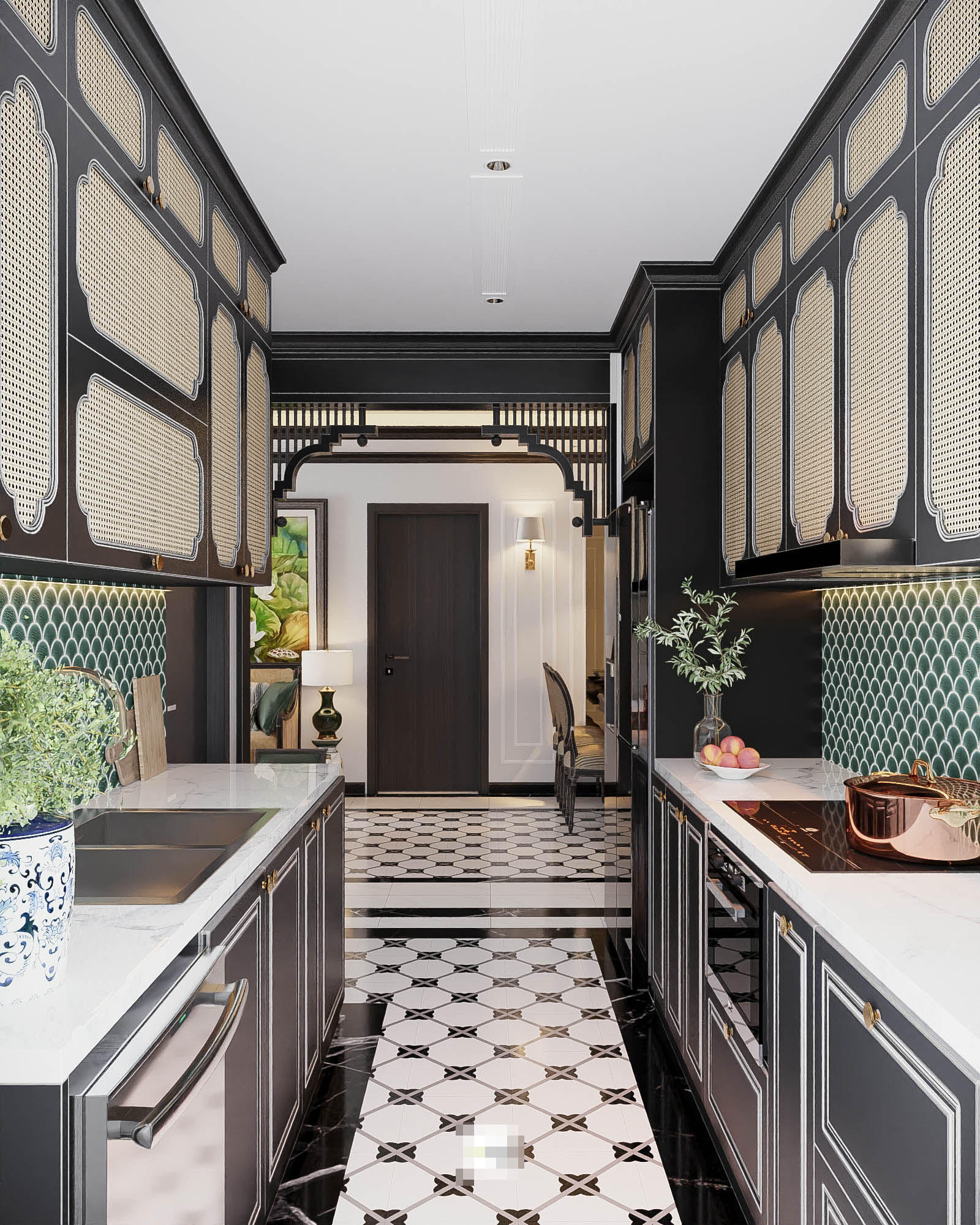 Nơi giữ lửa và kết nối của cả gia đình thông qua những bữa ăn. Hoa văn và song tiện gợi nhớ những ngôi nhà ở phố cổ Hà Nội.