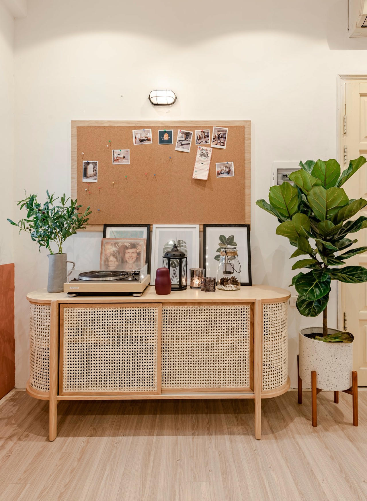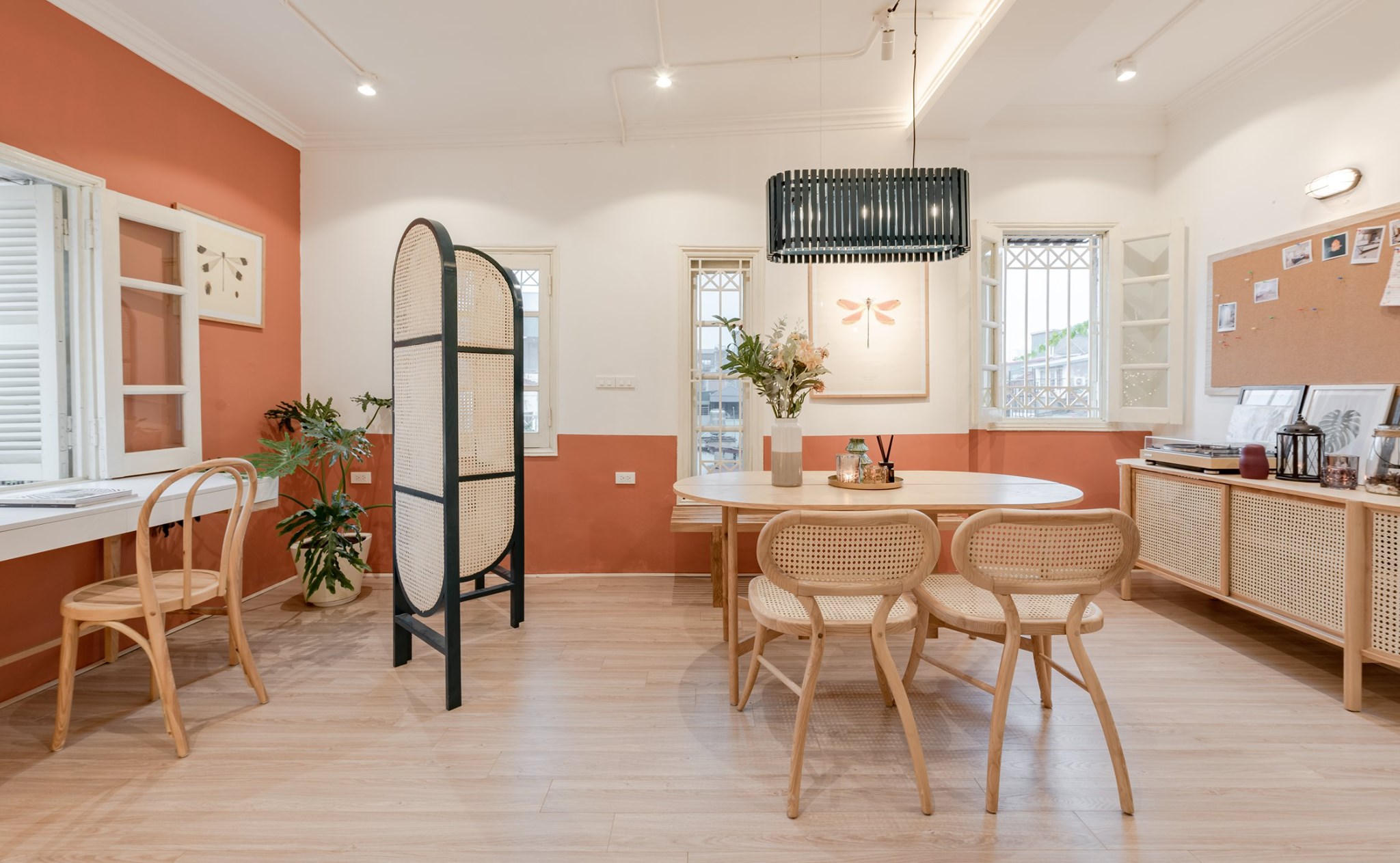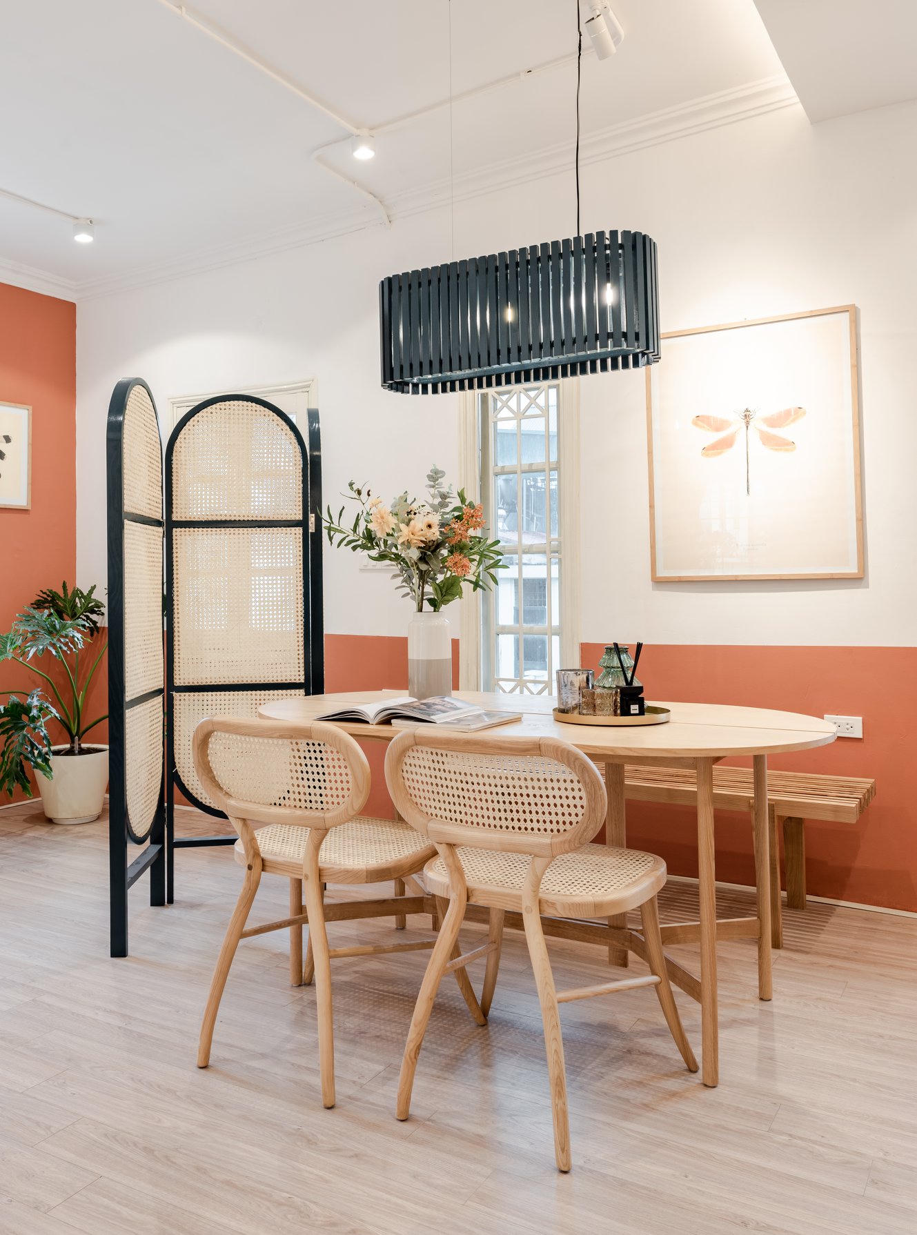 Vách ngăn bằng mây giữa phòng khách và nơi đọc sách tạo cho căn phòng trông rộng rãi và thoáng đãng hơn. |