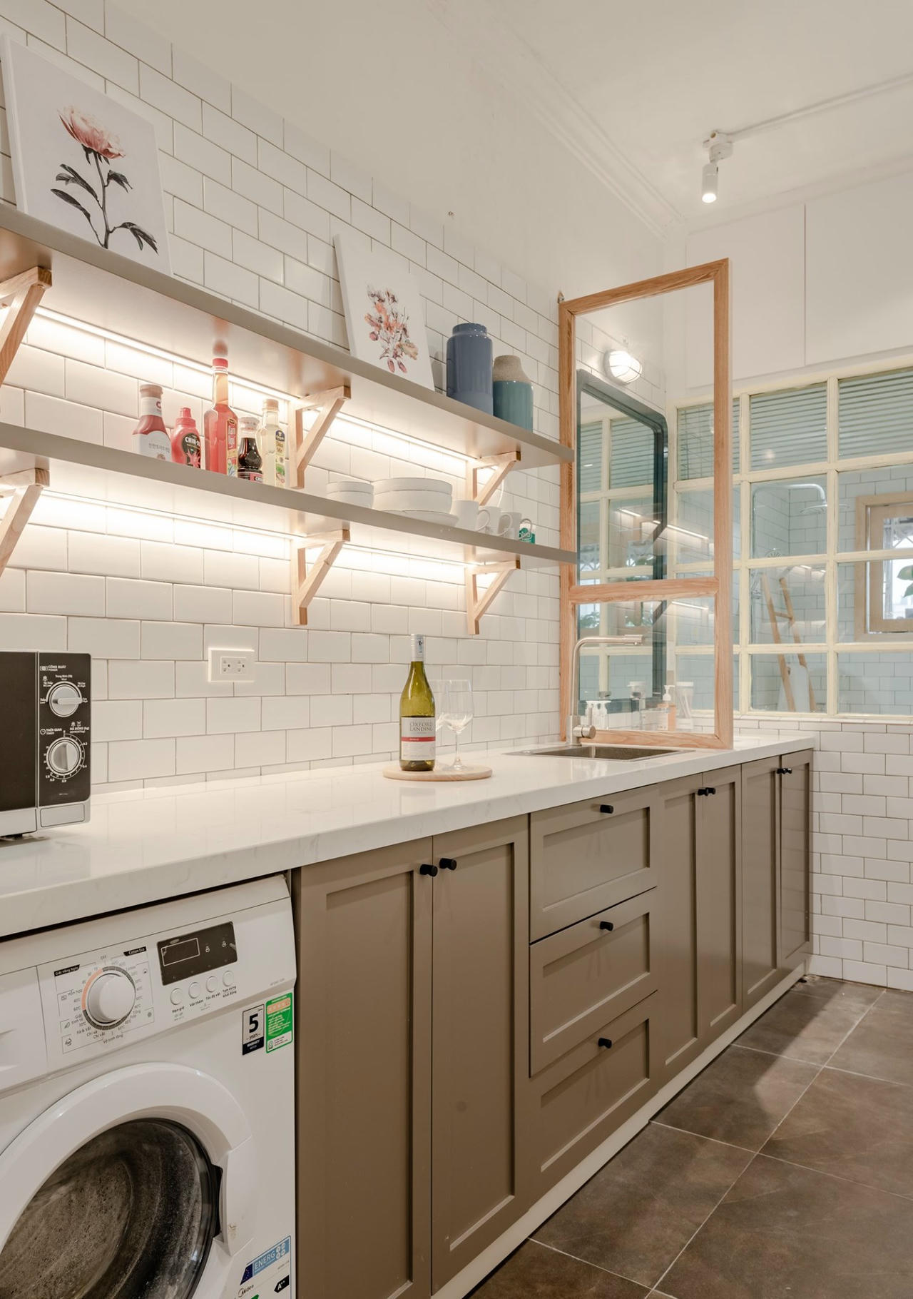 Vách ngăn giữa phòng bếp và phòng tắm được làm gỗ ốp kính trong suốt tạo cho căn nhà rộng rãi hơn. |