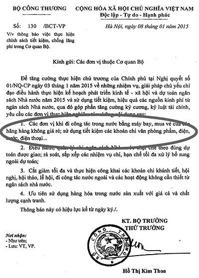 Hai ngày qua, dư luận xôn xao trước thông tin Bộ Công Thương ra Thông báo số 130 (ký ngày 8/1/2015, sau đó có chỉnh sửa vào ngày 23/1/2015) về việc thực hiện chính sách tiết kiệm, chống lãng phí trong cơ quan. Một trong những nội dung của văn bản này là yêu cầu cán bộ khi đi công tác bằng máy bay thì mua vé của hàng không giá rẻ. Ban đầu văn bản này ghi đích danh mua vé giá rẻ của Hãng hàng không Vietjet, sau đó chỉnh sửa lại, không nêu cụ thể Vietjet mà ghi chung chung là: các hãng hàng không giá rẻ.