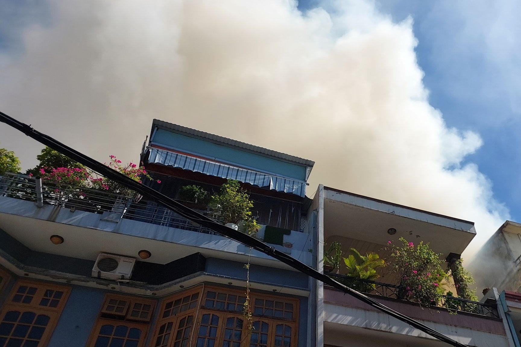 Thời điểm cháy, ngôi nhà đang chứa các thiết bị máy móc điện tử nên ngọn lửa bùng lên nhanh tạo cột khói đen bốc cao hàng chục mét và lan xuống tầng dưới.