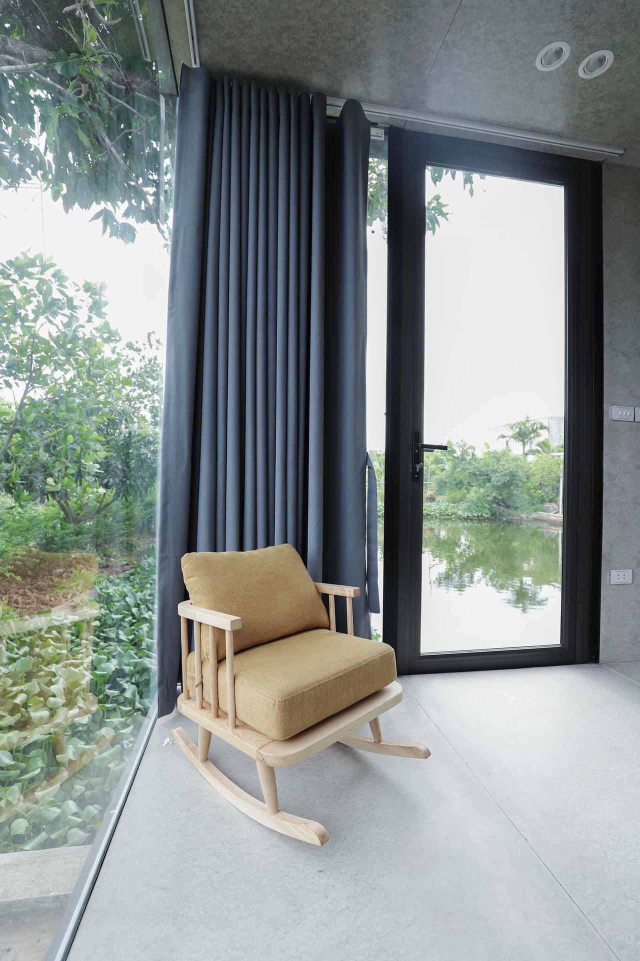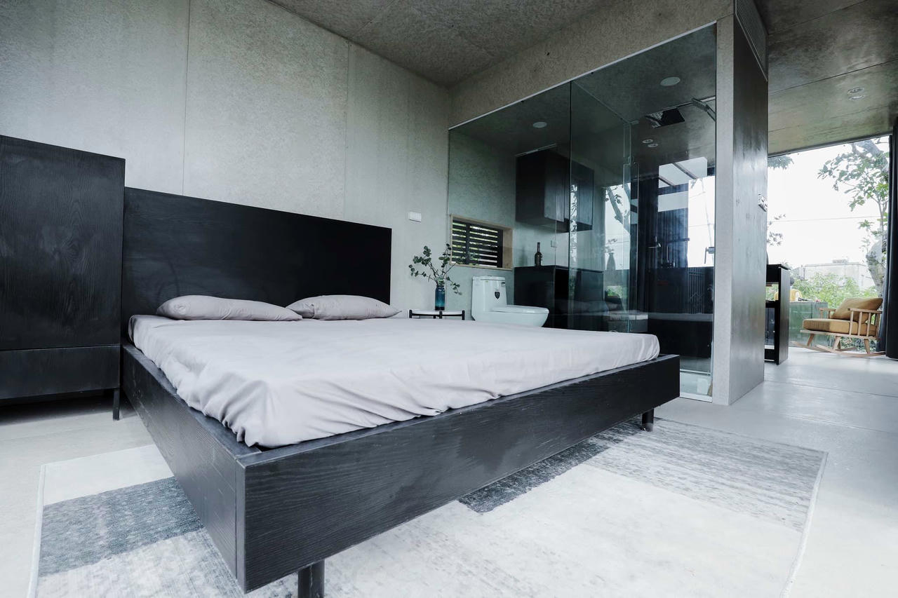 Hệ vách kính cường lực, cửa nhôm kính, khung sắt bọc các lớp cách nhiệt, chống nóng, nan gỗ tự nhiên cùng với tông màu đen đem lại cảm giác nổi bật. |